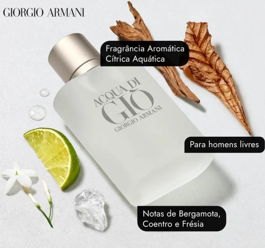 Acqua di Giò é um perfume Giorgio Armani masculino aquático e fresco. Proporciona uma sensação de liberdade, juventude e equilíbrio para homens livres.