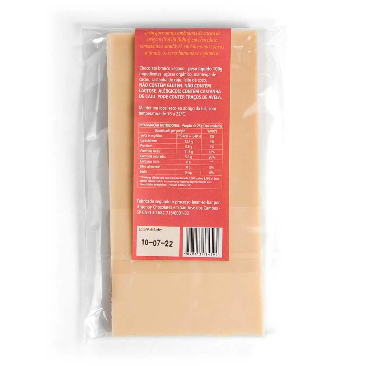 Quem disse que Chocolate branco precisa ter leite? Na Argonay o chocolate branco é feito com leite de coco e castanha de caju levemente torrada.