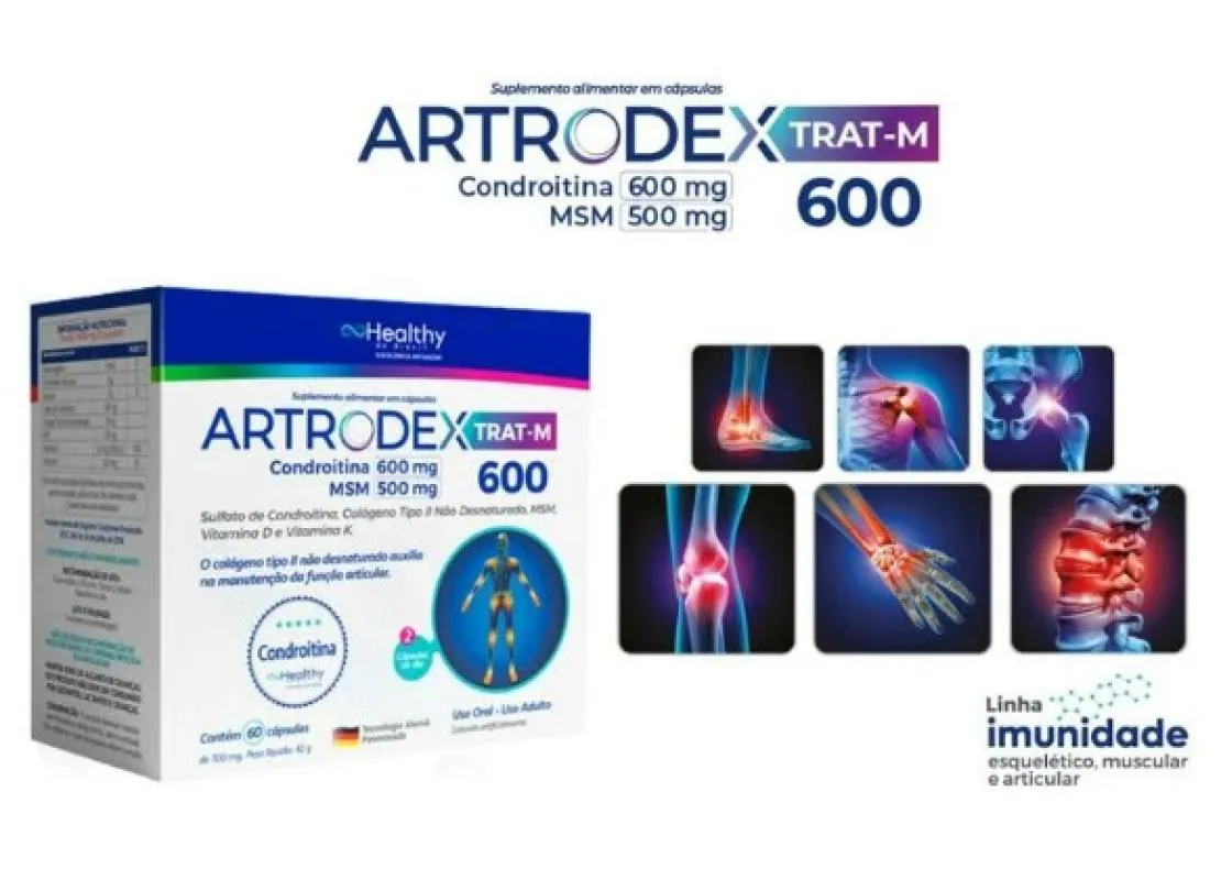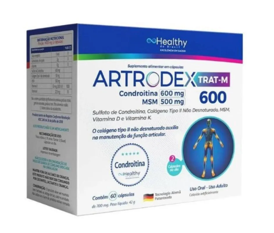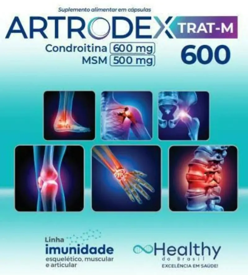 Indicado para as articulações. Auxilia na reposição da cartilagem. Indicado para artrite, artrose e outros problemas articulares Ajuda a aliviar as dores. Tecnologia alemã patenteada. Embalagem com 60 cápsulas. Recomendação de uso do Artrodex Trat-M 600 É recomendável o consumo de duas cápsulas ao dia.