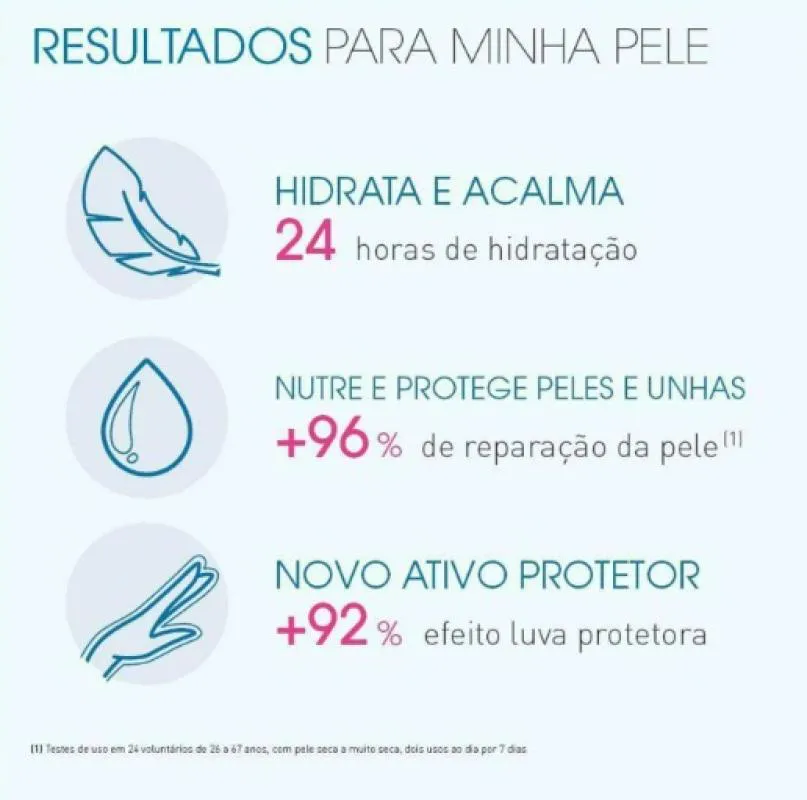 Sua fórmula conta com ativos, como vitamina c Glicosada, Vitamina E e Niacinamida que promovem um efeito de luva, formando um filme protetor de longa duração para manter a pele hidratada e protegida. Além disso, possui ingredientes que fortalecem as unhas de forma duradoura.