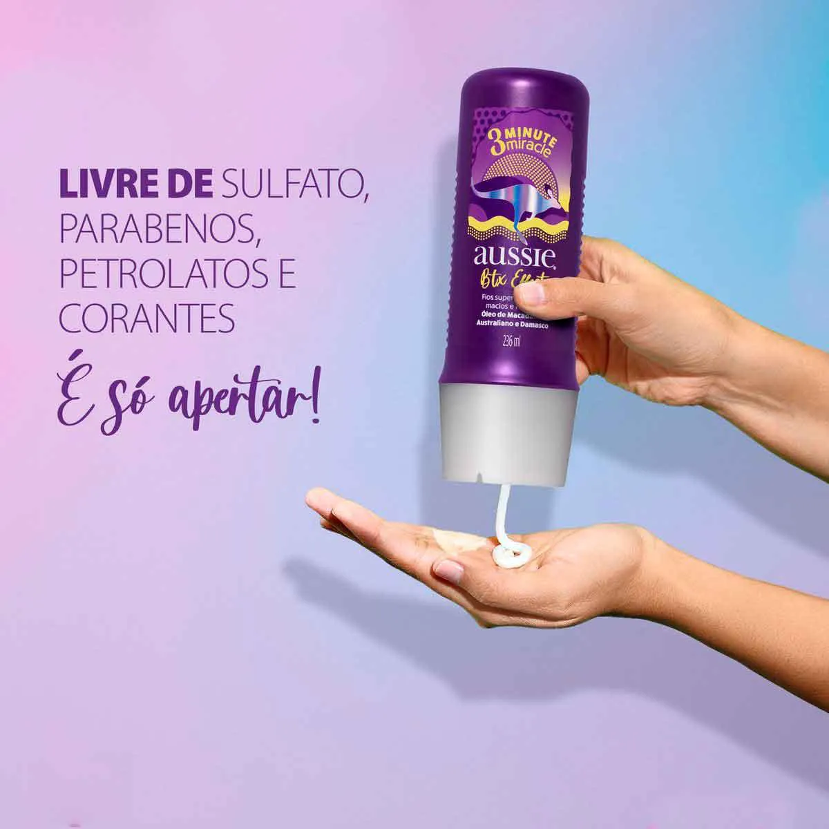 - Com o cabelo úmido, após o uso do condicionador, aplique o Aussie 3 Minute Miracle nos fios e use os dedos para pentear e distribuir o produto por todo o comprimento.