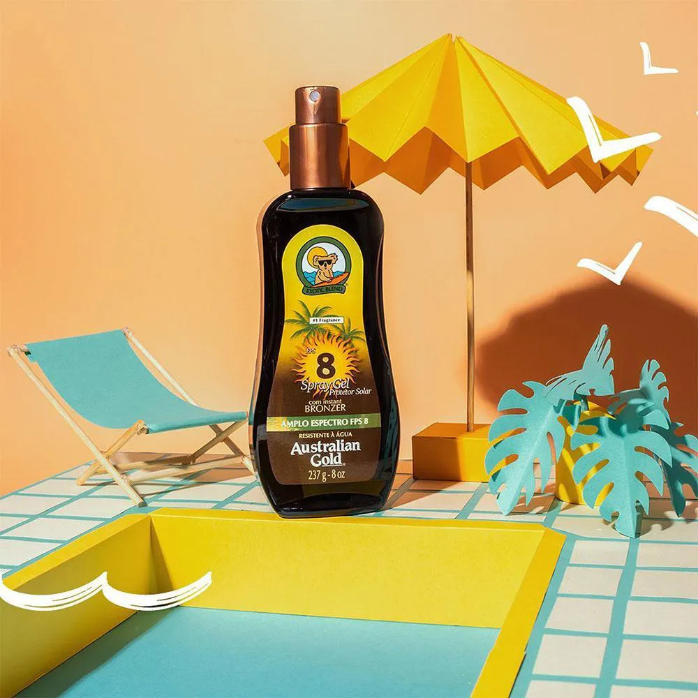 Protetor solar corporal em spray. Australian Gold FPS 8 oferece proteção contra os raios UVA e UVB e uniformiza o tom da pele. Australian Gold possui bronze para deixar a pele imediatamente com cor, ingredientes, hidratantes e calmantes que garantem toque macio, e sua pele ainda mais perfumada. * RESULTADO: Proteção Solar * SUGESTÕES DE USO: