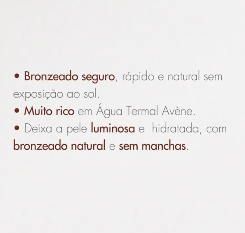 O Autobronzeador Avène Autobrozant Hydratant foi desenvolvido para fornecer à sua pele uma coloração saudável, mesmo sem sol. Sua composição hidratante com cor, conta com Água Termal Avène, com proporiedades refrescantes: a superfície da pele fica harmoniosa, sem textura engordurada, tanto no Corpo, quanto no Rosto.