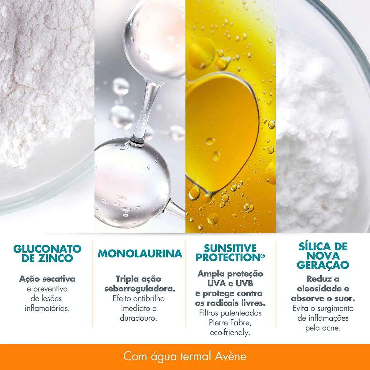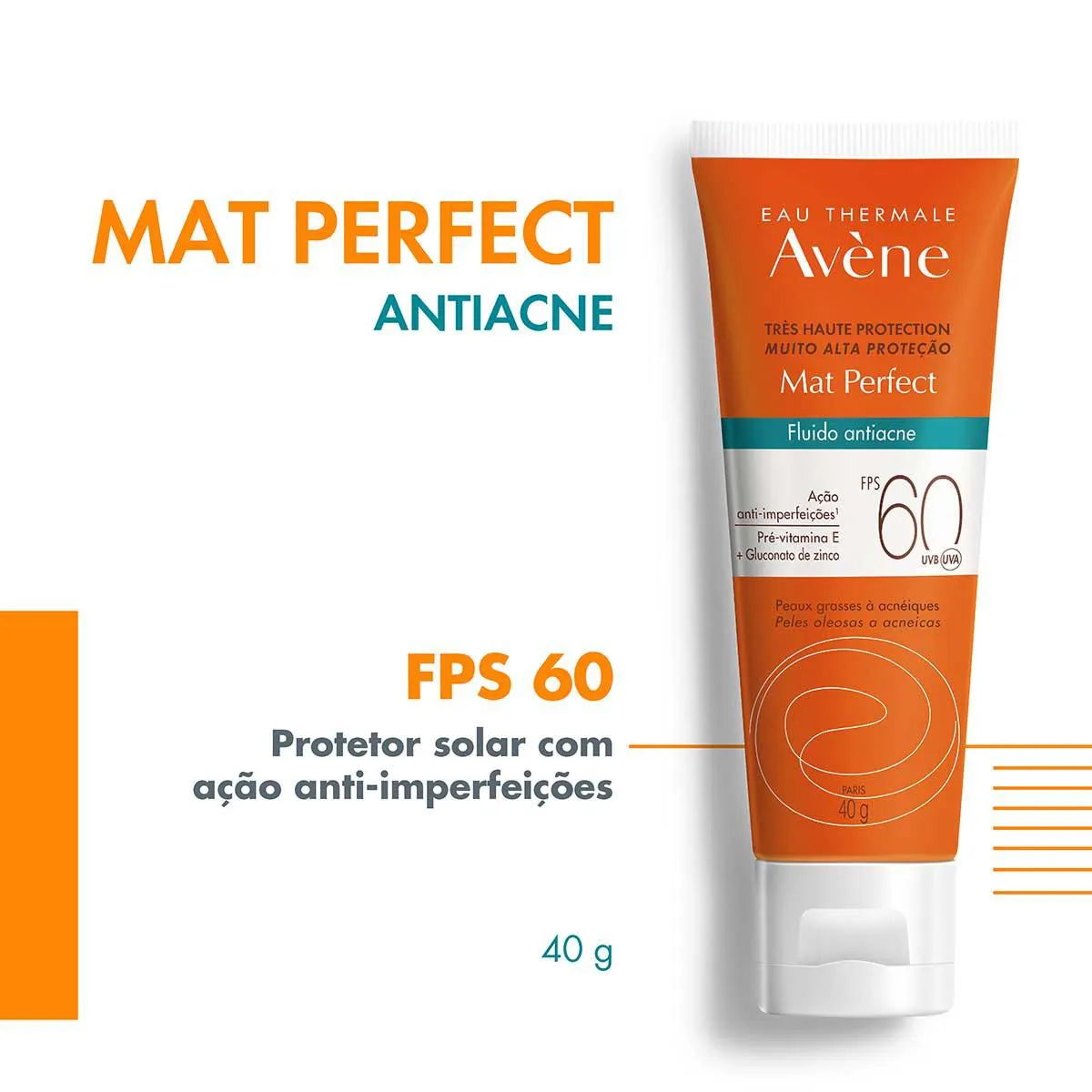 Avène Mat Perfect Fluido Antiacne é um filtro solar desenvolvido com tecnologia avançada para garantir múltiplos benefícios. Além da alta proteção contra os raios UVA e UVB (FPS 60), ele controla a oleosidade, matifica a pele por até 12 horas, e ainda reduz em até 69% as lesões relacionadas à acne.