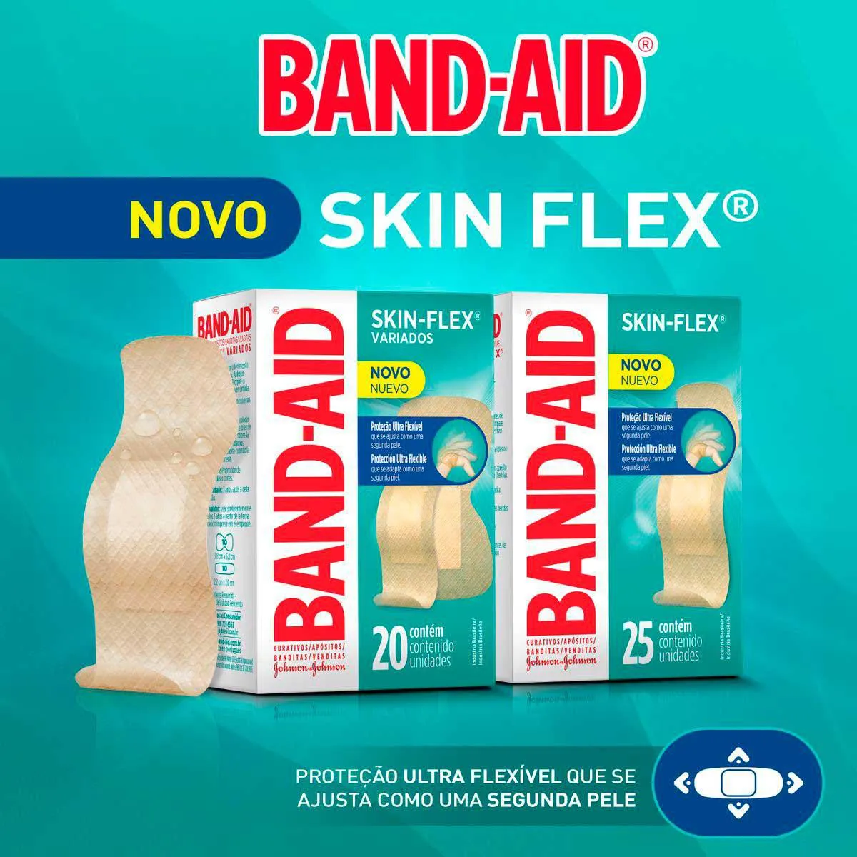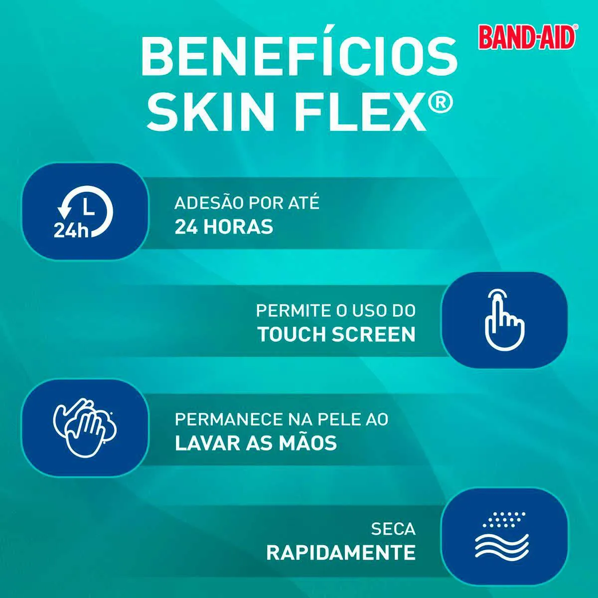 O Band-Aid Skin-Flex foi projetado para se mover como uma segunda pele, proporcionando flexibilidade, conforto, secagem rápida e retenção por até 24 horas.