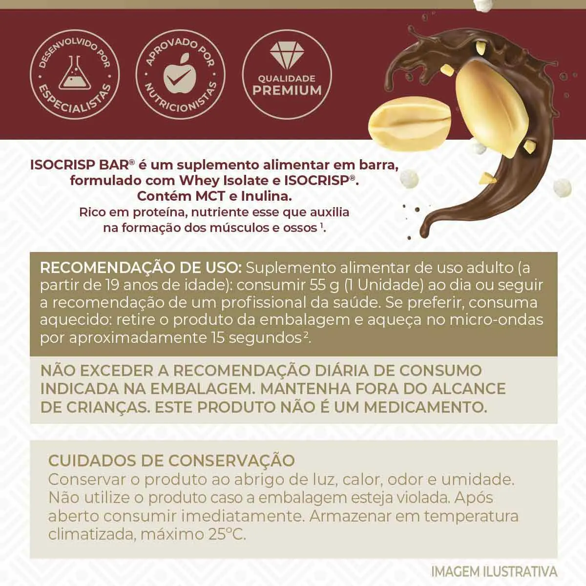 O que é: A Barra de proteína Isocrisp Amendoim é um suplemento alimentar em barra, com baixo teor de sódio, formulado com Whey Isolate e ISOCRISP.