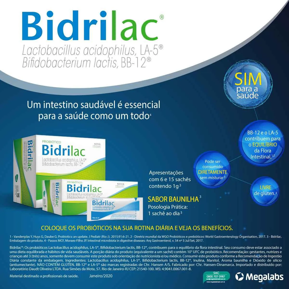 Os probióticos contidos em Bidrilac contribuem para o equilíbrio da flora intestinal e, consequentemente, com a saúde do organismo como um todo. Deve ser associado a uma dieta equilibrada e hábitos de vida saudáveis. Recomendado para adultos.