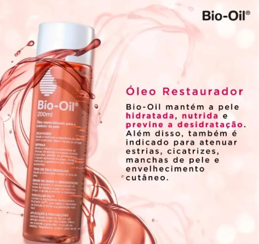 O Óleo de Tratamento Bio-Oil traz em sua fórmula o exclusivo Purcellin Oil, que facilita a absorção e forma um leve filme, não gorduroso. Sua ação previne a formação de estrias enquanto melhor a textura existentes, em casos de mudança repentina de peso, gravidez* e fatores genéticos, além de minimizar a aparência de cicatrizes e tons desiguais, novas ou antigas, como as de queloides, queimaduras, picadas de insetos, arranhões, acidentes, acne, pós-cirúrgico, catapora.