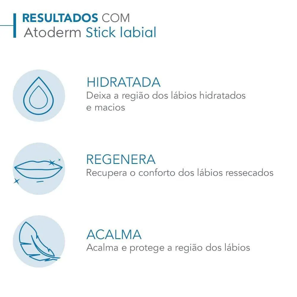 Proporciona reparação em Lábios ressecados e fragilizados. Recupera o conforto dos lábios deixando a região hidratada, macia e suavizada. Textura leve que hidrata sem deixar os lábios esbranquiçados. * RESULTADO: Ação Hidratante * SUGESTÕES DE USO: 1.Aplicar nos lábios com leve batidas. * OBSERVAÇÕES: Imagem Meramente Ilustrativa * ITENS INCLUSOS: 1 Bioderma Atoderm Stick Labial Cremoso 4 g