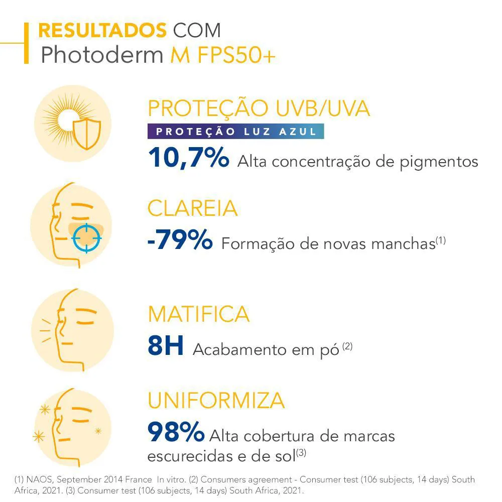 Protetor Solar Facial Matte FPS 50+ Bioderma Photoderm M Dourée protege, clareia manchas, uniformiza e matifica. Fórmula enriquecida com o ativo uniformizador.