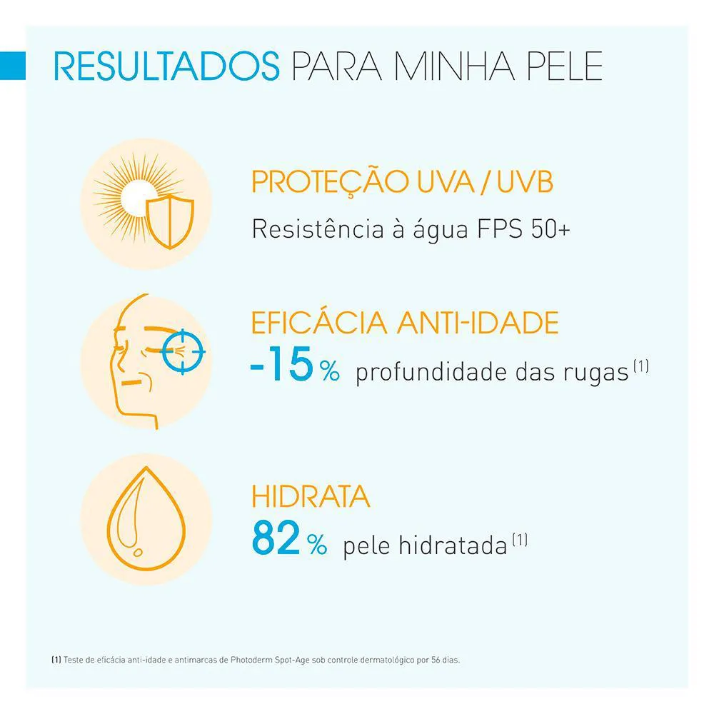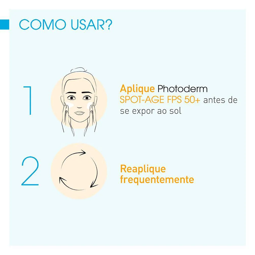 Proteção solar com vitamina c e ação antioxidante reforçada para reduzir rugas em 28 dias * RESULTADO: Antiidade * SUGESTÕES DE USO: Passe uma camada uniforme e generosa do protetor na pele, antes da exposição solar. Se a quantidade aplicada não for adequada, o nível de proteção será significativamente menor. É necessário reaplicar Photoderm Spot-Age com frequência para manter sua efetividade: após sudorese intensa; depois de nadar, banhar-se ou secar-se com toalha; durante a exposição ao sol. Este produto não oferece nenhuma proteção contra insolação. Photoderm Spot-Age ajuda a prevenir as queimaduras solares. Não usar o produto em crianças - ao ideal é evitar exposição prolongada das crianças ao sol. Usar o protetor diariamente diminui o risco de fotoenvelhecimento e de marcas escurecidas na pele. * OBSERVAÇÕES: Imagem Meramente Ilustrativa * ITENS INCLUSOS: 1 Bioderma Photoderm Spot Age50+ Protetor Solar Facial 40ml
