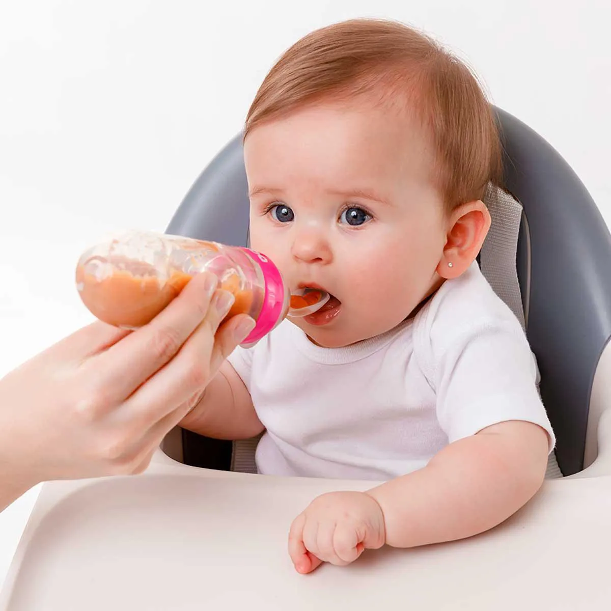 - É 2 em 1: além de colher, ela armazena a papinha para dosar o alimento na medida certa para o bebê.