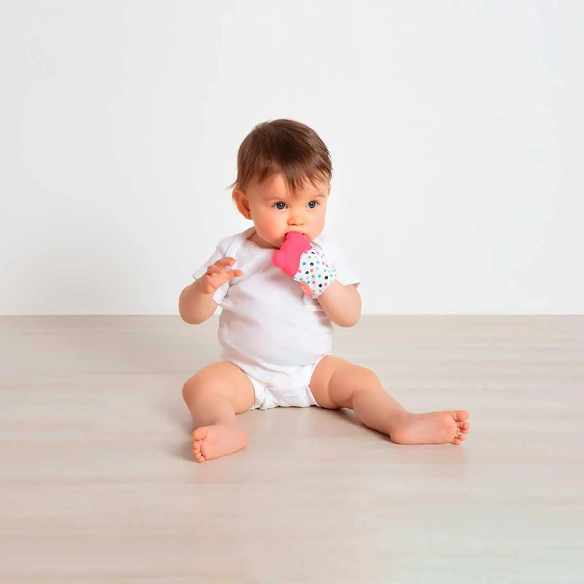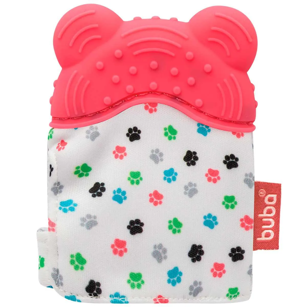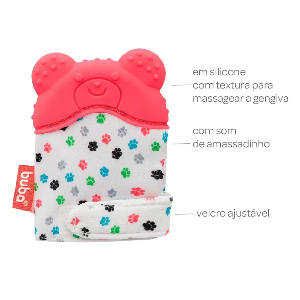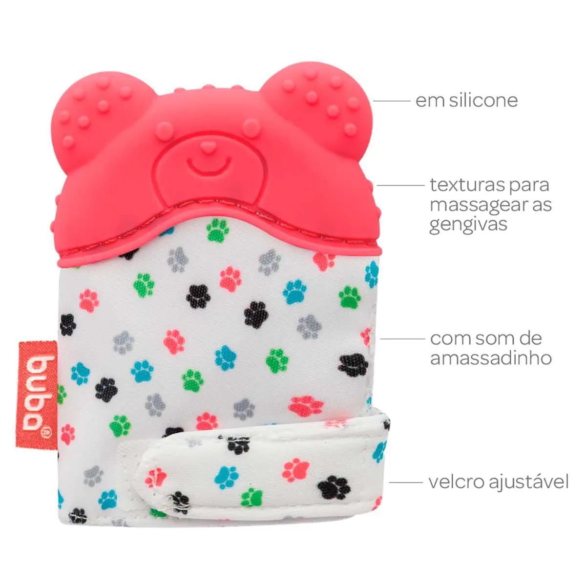 Sua ponta de silicone com textura macia faz uma massagem suave na gengiva da criança, quando ela a põe na boca aliviando as dores causadas pelos primeiros dentinhos. Ela também estimula os sentidos através das cores e o barulho de amassadinho. O fecho em velcro faz com que a luvinha se encaixe perfeitamente para que não escorregue da mão do pequeno, protegendo o bebê da mastigação.