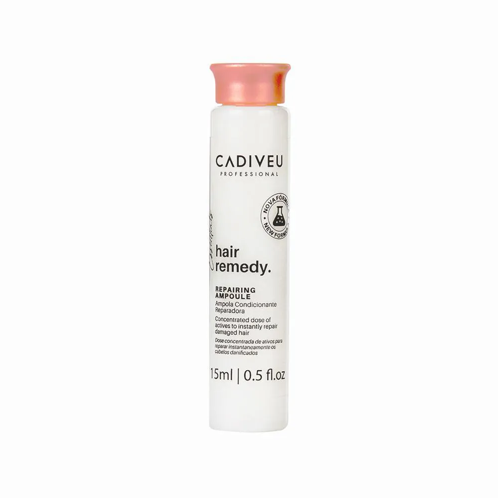2. Deixar agir de 5 a 10 minutos e enxaguar. * OBSERVAÇÕES: Imagem Meramente Ilustrativa * ITENS INCLUSOS: 1 Caixa de Ampola Reparadora Cadiveu Essentials Hair Remedy com 10 unidades de 15 ml cada.