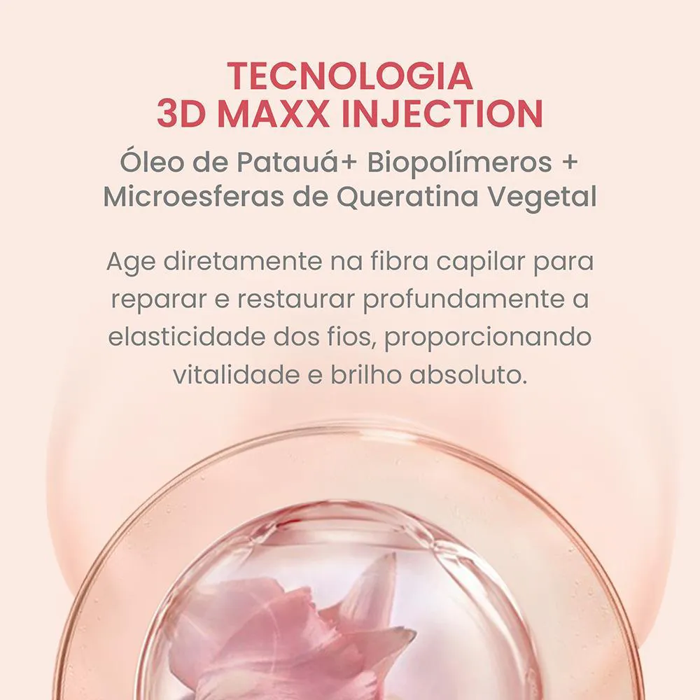 A nova linha Hair Remedy é a cura para cabelos Danificados. A Ampola Reparadora de Hair Remedy é um tratamento monodose com fórmula altamente concentrada enriquecida com um Complexo Vegetal de Algas em associação com Ácido Lático para uma dose profunda e instantânea de reparação para recuperar cabelos danificados. A mesma performance incrível agora com formulação 100% vegana! 3D MAXX INJECTION | Óleo de Patuá: originário da palmeira da Amazônia, rico em ácidos graxos essenciais, hidrata e restaura a maciez dos fios. Biopolímeros: regeneram as fibras capilares desde o interior, promovendo uma reparação profunda. * RESULTADO: