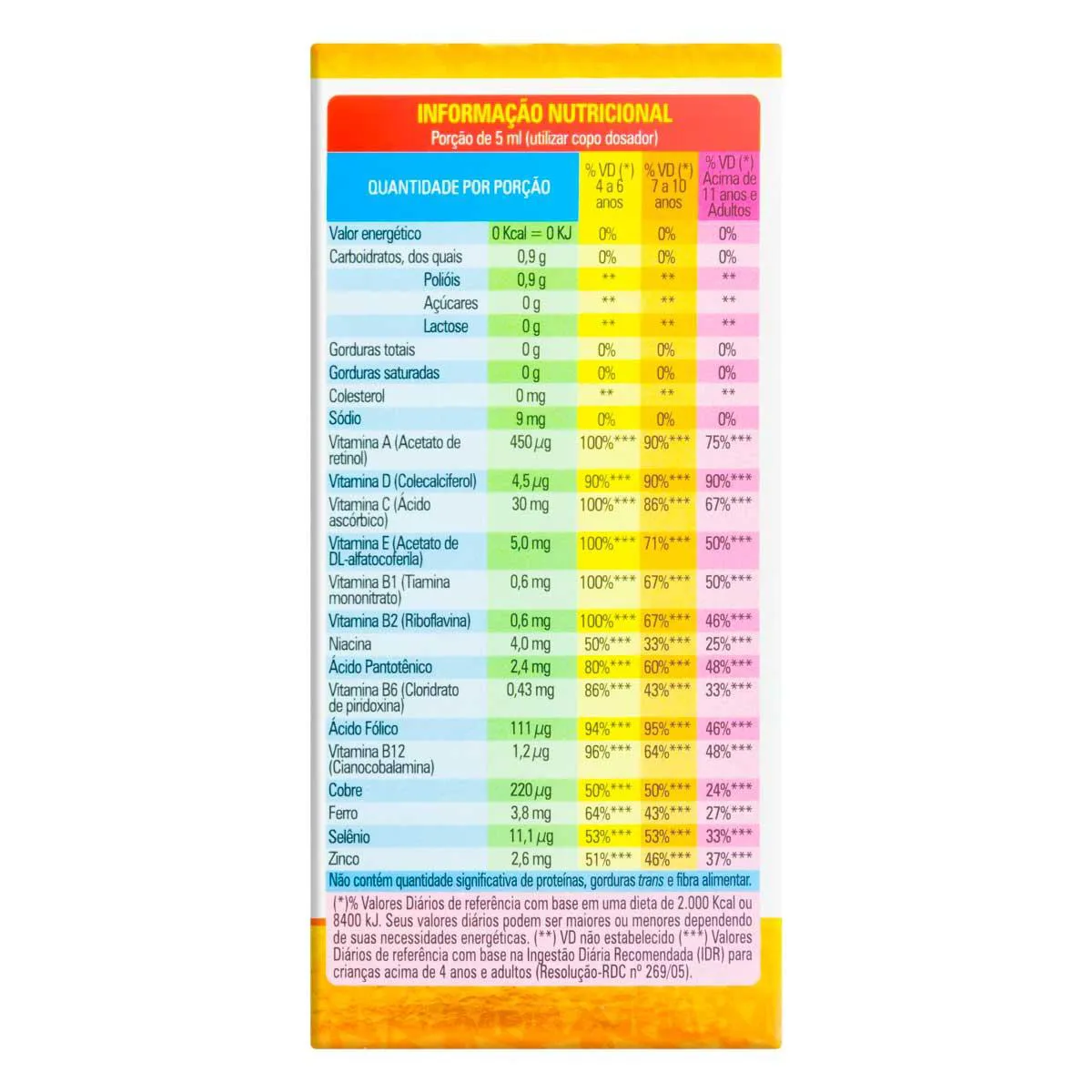 Vitamina A (acetato de retinol), vitamina c (ácido ascórbico), Vitamina D (colecalciferol), Vitamina E (acetato de DL-alfatocoferila), Vitamina B1 (tiamina mononitrato), Vitamina B2 (riboflavina), Niacina (nicotinamida), Ácido Pantotênico (D-pantotenato de cálcio), Vitamina B6 (cloridrato de piridoxina), Ácido fólico, Vitamina B12 (cianocobalamina), Cobre (sulfato cúprico), Ferro (sulfato ferroso), Zinco (sulfato de zinco monoidratado), Selênio (selenito de sódio).