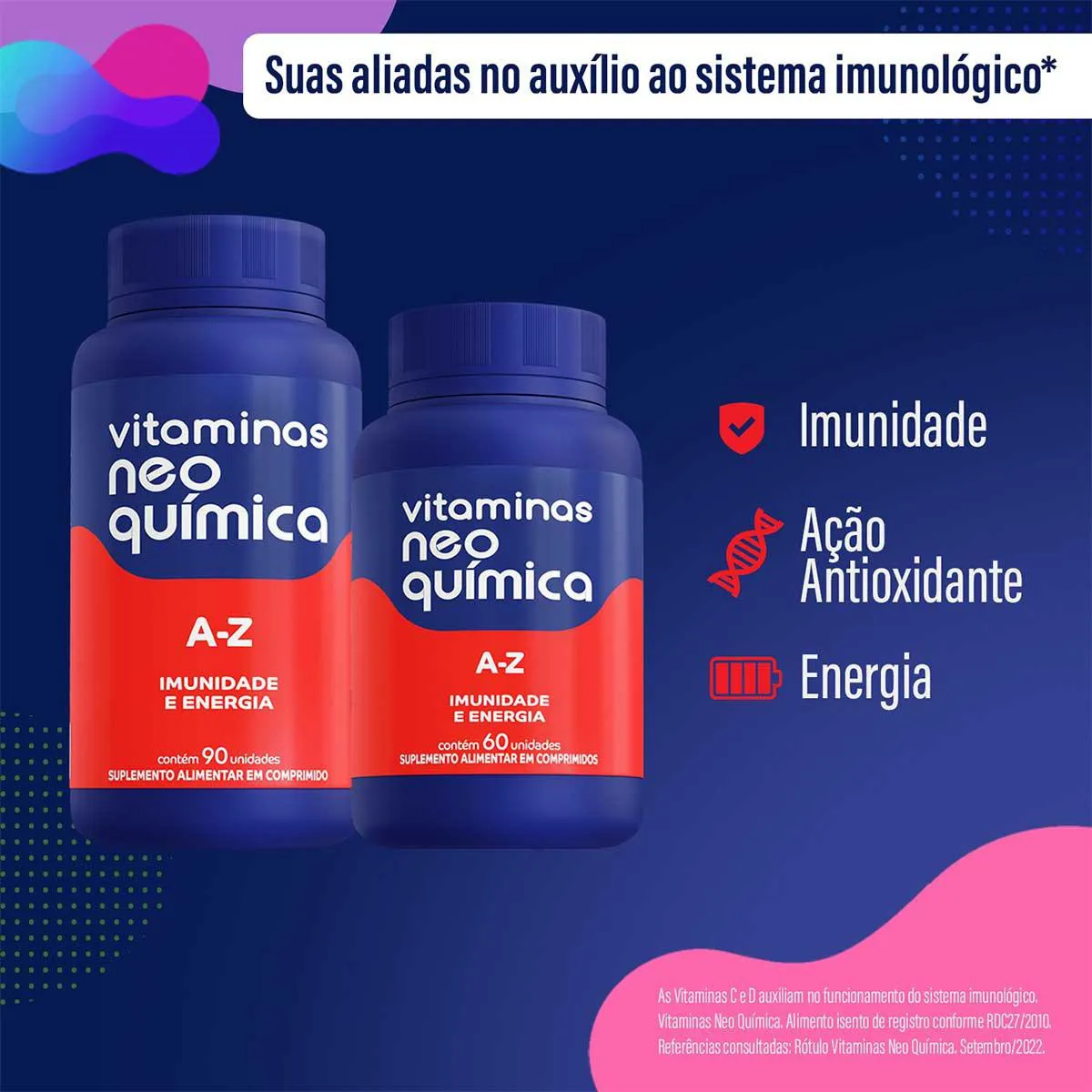 Neo Química A-Z é ideal para complementar as necessidades nutricionais na dose certa. Sua fórmula possui antioxidantes, ajuda na imunidade e dá mais energia para realizar suas atividades do dia-a-dia.