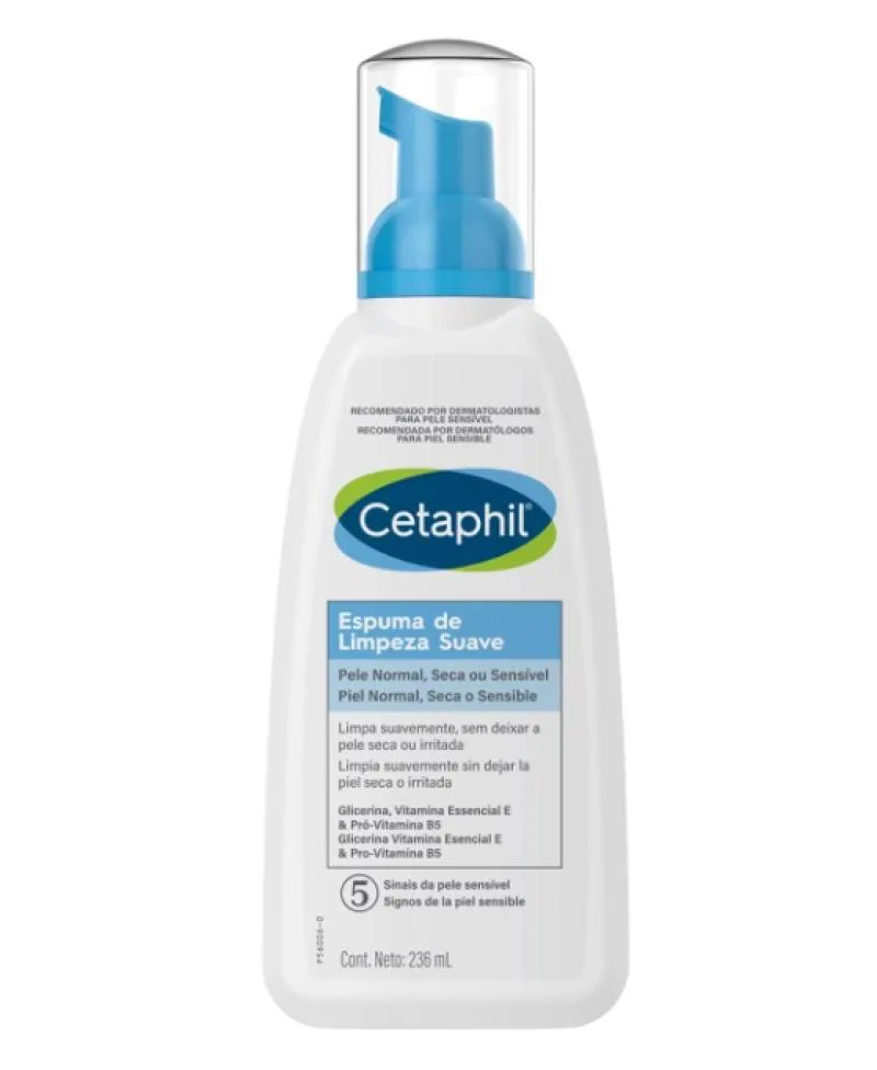 Espuma de limpeza facial para Pele Equilibrada, seca e sensível. Cetaphil Suave limpa com suavidade, sem remover a hidratação natural da pele.