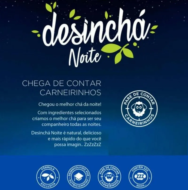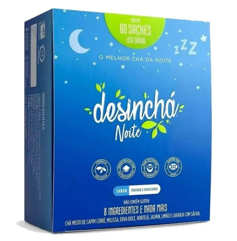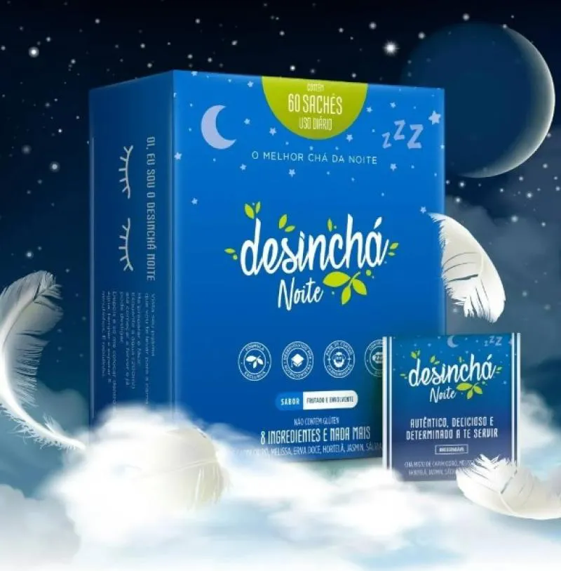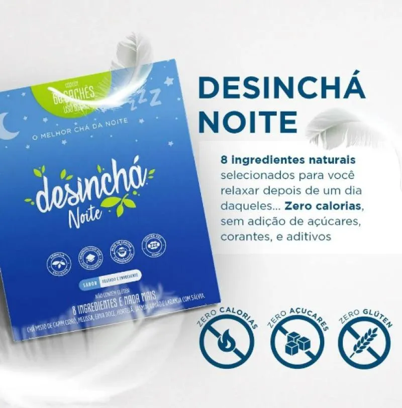 Criado para ser o seu último hábito saudável da noite e com sabor frutado e envolvente. O Desinchá Noite traz oito ingredientes cuidadosamente selecionados para revolucionar suas noites. Ideal para tomar antes de dormir, ele também é perfeito depois de um dia daqueles de trabalho, sem falar que desce gostoso como uma ida ao spa.