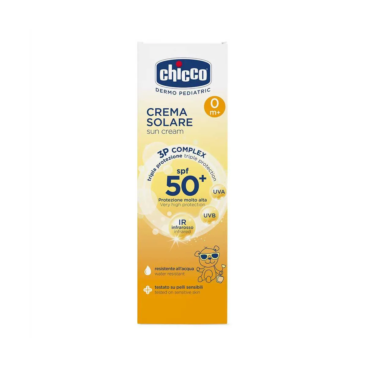 É um protetor solar desenvolvido para pele sensível do bebê. Sua fórmula é livre de de parabenos, fenoxietanol e álcool. Protege contra os raios UVA, UVB e irradiação solar. Testado em pele sensível e resistente à água.