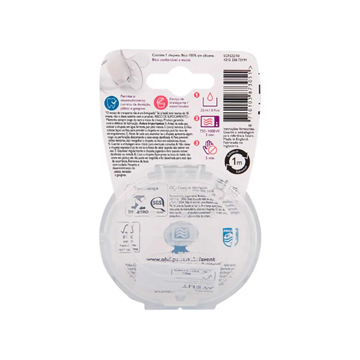 Para que serve: Proteção flexível e suave pois a pele delicada precisa de cuidado extra. A nossa tecnologia FlexiFit permite que esta proteção siga as curvas naturais do Rosto do seu bebê para uma adaptação confortável. O seu bebê terá menos marcas e irritação na pele. A pele precisa de respirar, especialmente a do seu bebê. A nossa proteção tem 6 entradas de ar para um fluxo de ar adicional, concebida para reduzir a irritação da pele. Bico flexível de silicone com formato simétrico que respeita o desenvolvimento do palato, dentes e gengivas do bebê. O bico macio e texturizado em silicone desta chupeta acalma e conforta o seu bebê.