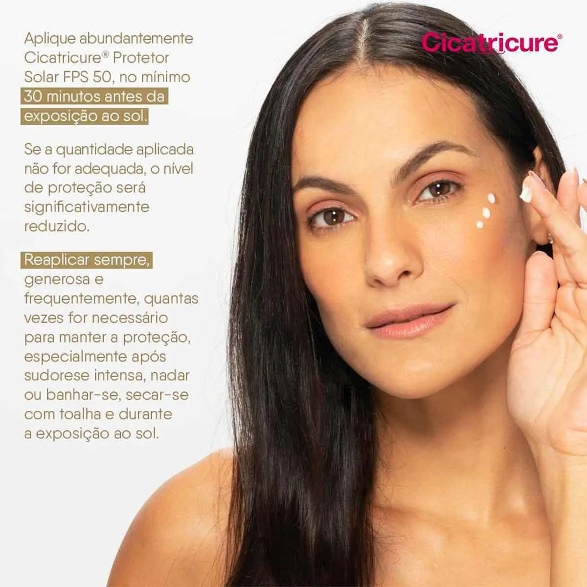 Aplique abundantemente Cicatricure Protetor Solar FPS 50, no mínimo 30 minutos antes da exposição ao sol.Se a quantidade aplicada não for adequada, o nível de proteção será significativamente reduzido. Reaplicar sempre, generosa e frequentemente, quantas vezes for necessário para manter a proteção, especialmente após sudorese intensa, nadar ou banhar-se, secar-se com toalha e durante a exposição ao sol.