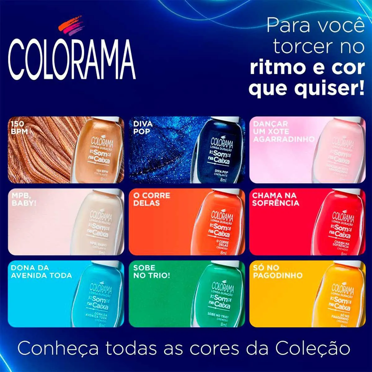 O Dançar um Xote Agarradinho é um esmalte Colorama da linha Som na Caixa, uma coleção exclusiva que conta com 9 cores incríveis, que transmitem muita alegria e humor, representando uma das épocas mais contagiantes para os brasileiros, a Copa do Mundo.