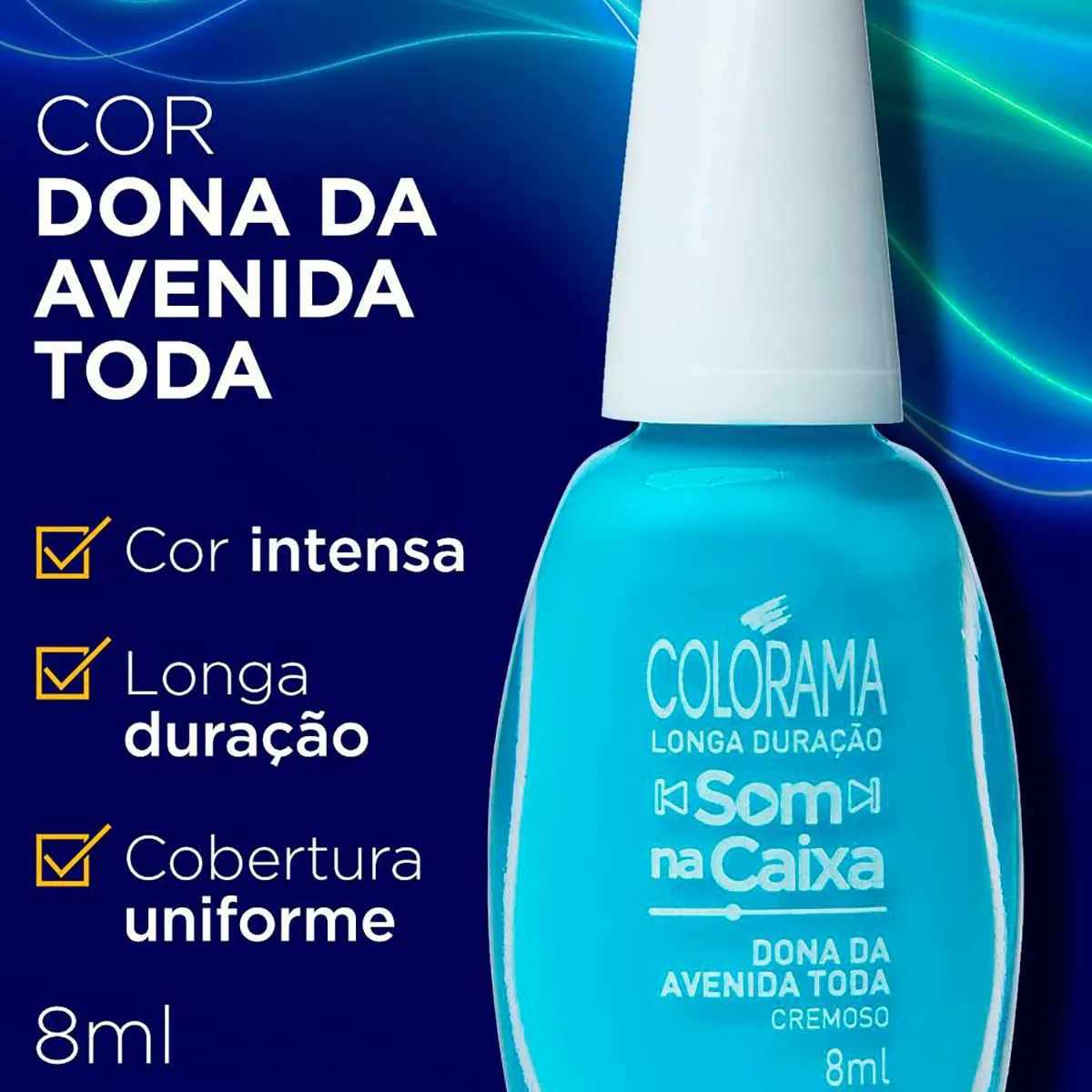 O Dona da Avenida Toda é um esmalte Colorama da linha Som na Caixa, uma coleção exclusiva que conta com 9 cores incríveis, que transmitem muita alegria e humor, representando uma das épocas mais contagiantes para os brasileiros, a Copa do Mundo.
