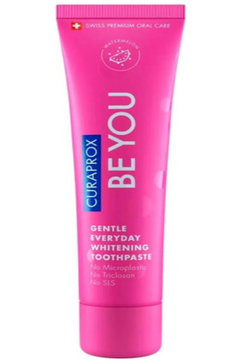 Benefícios e diferenciais da Pasta de Dente Curaprox Be You Candy Lover Rosa Agradável sabor de Melancia. Ação cicatrizante. Atua na manutenção do clareamento profissional. Contribui com a melhoria da saúde oral e para tornar a escovação prazerosa. Desenvolvida por profissionais especialistas em sabores, aromas e fragrâncias da Givaudan. Sensação suave o dia todo. Hálito fresco de longa duração. Livre do Lauril Sulfato de Sódio. Produto vegano (não possui componentes de origem animal).