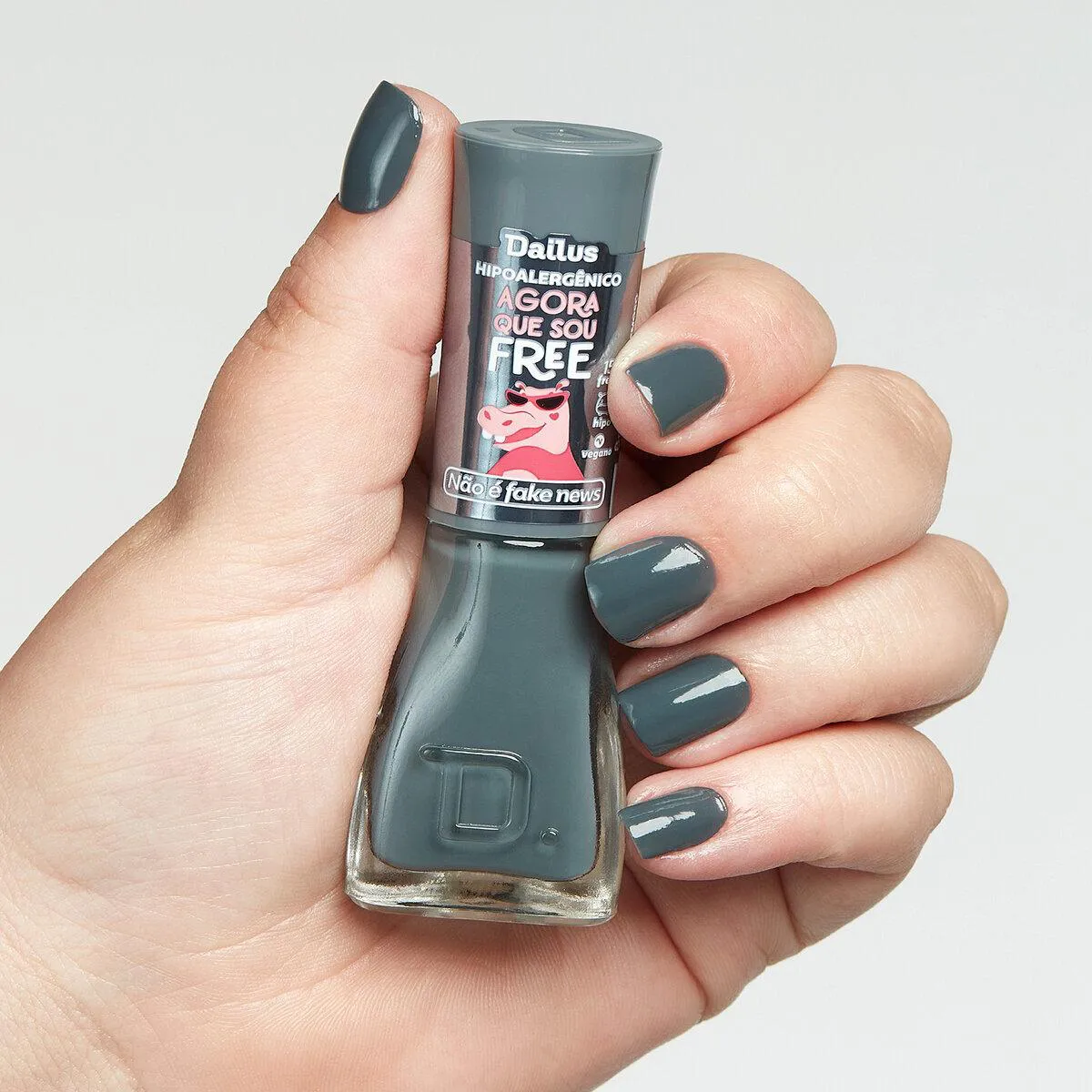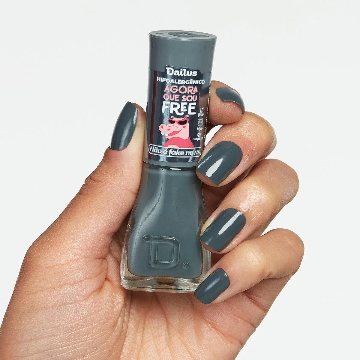 O Esmalte Não é Fake News faz parte da coleção Dailus Agora Que Sou Free. Ele é hipoalergênico e 15-free, possui acabamento cremoso, brilho intenso, secagem rápida e longa duração. Além disso, é vegano e cruelty-free (livre de crueldade animal).