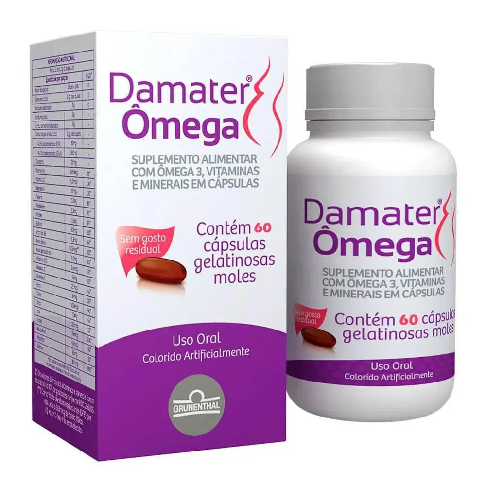 Damater Ômega é um suplemento para gestantes e lactantes, fonte de Ômega 3, e que contém adicionalmente vitaminas e minerais em sua formulação. Os ácidos graxos ômega 3 EPA e DHA auxiliam na redução dos triglicerídeos; O ácido fólico auxilia na formação do feto durante a gravidez; O ferro auxilia na formação das células vermelhas do sangue e no transporte do oxigênio no organismo; A Vitamina A auxilia na visão; O ácido fólico, o ferro e as vitaminas A, B12, B6, C e D auxiliam no funcionamento do sistema imune.
