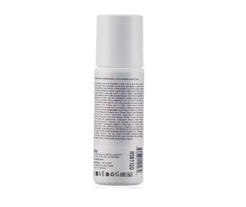 Com 72% de ingredientes orgânicos certificados, o DESODORANTE ROLL-ON LAVANDA LAFE'S não tem parabenos, propilenoglicol, álcool ou alumínio, sem testes em animais e oferece uma proteção natural contra as bactérias que causam odor, e mantém calmo e relaxad