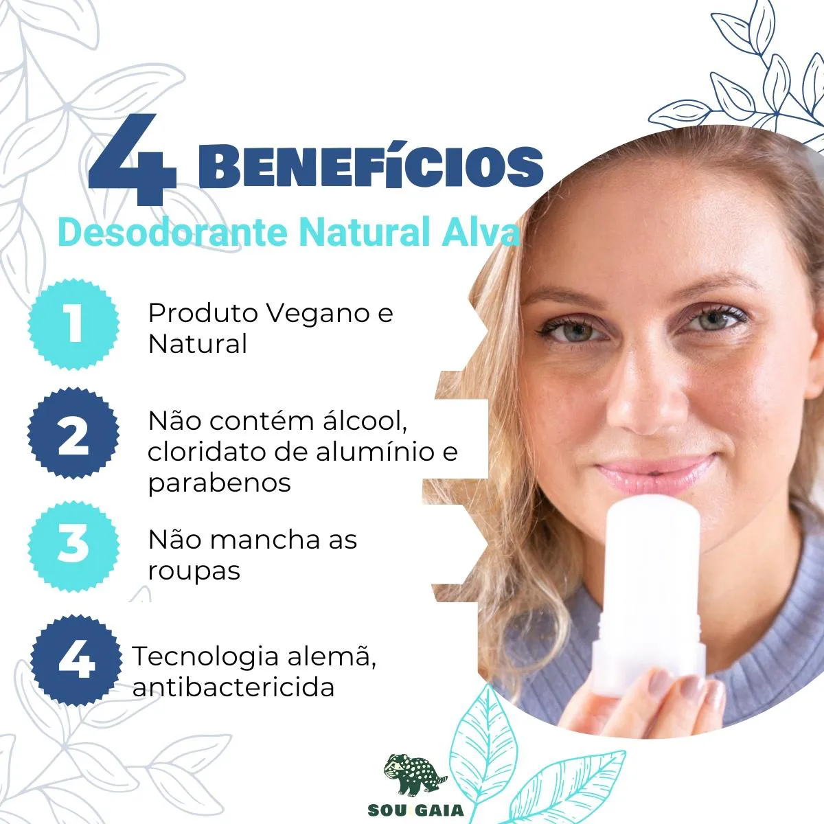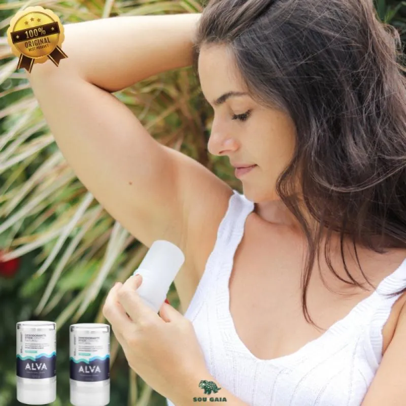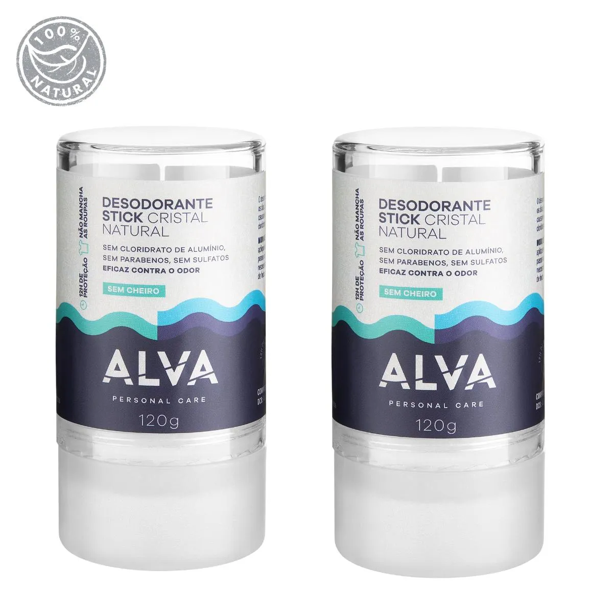 **APROVEITE KIT C/2 UNID. 120g + 120g!**   O Desodorante Cristal Alva é elaborado com um sal Mineral natural. Com duração de até 2 anos, ele combate as bactérias causadoras do mau odor sem obstruir os poros, não deixa manchas nas roupas ou resíduos na pele - e é a alternativa natural perfeita para cuidar de você!   O único ingrediente do Desodorante Cristal Alva é o alúmen de potássio, um poderoso sal mineral com efeito antibacteriano, que impede a proliferação de bactérias causadoras de maus odores. O alúmen de potássio não é absorvido pela pele por ter moléculas grandes, e reduz levemente a transpiração sem entupir os poros.   Ele é bactericida, pois elimina as bactérias que causam o cheiro e faz com que nosso Corpo transpire normalmente. O alúmen está presente normalmente em grandes depósitos em todo o mundo, em áreas de atividade vulcânica.   Alva é uma marca alemã premiada por seus produtos naturais.   Como funciona o nosso corpo?   Nós precisamos suar, é no suor onde liberamos toxinas, controlamos PH e temperatura do corpo, quando colocamos um desodorante antitranspirante, impedimos que todas essas reações naturais do corpo aconteçam.   E para onde vai essas toxinas?   Fica no nosso corpo, numa região super sensível que é a nossa mama, isso causa alergias, irritações, foliculite, nódulos e até mesmo doenças mais graves.   Por que o alúmen é tão eficaz nos desodorantes?   Quando o corpo humano transpira é liberado basicamente sal e água através das glândulas sudoríparas. Contrariamente à crença popular, o suor não tem um cheiro distinto. O cheiro desagradável é resultado do contato do suor com as bactérias do nosso corpo. As bactérias em nossa pele geralmente não produzem um odor perceptível, mas quando o suor está presente, a bactéria se prolifera rapidamente, criando cheiro. O alúmen é antimicrobiano, portanto, ele inibe o crescimento das bactérias das axilas.   Ao inibir o crescimento bacteriano o odor é impedido, e o corpo ainda é capaz de manter o seu próprio curso de eliminar toxinas através do suor, assim como de controlar a temperatura do corpo.   O desodorante da Alva é em forma de cristal que pode durar até 2 anos usando todos os dias. É translúcido, cristalino, inodoro e incolor e não mancha as roupas.   Modo de usar: Umedecer o cristal com água e aplicar em toda região das axilas, repetir quando secar ajuda na maior proteção. Não usar se a pele estiver lesionada ou irritada. Caso ocorra irritação suspender o uso. O cristal pode se soltar da base ao longo do uso. Se cair no chão, o cristal quebra.   Mudança de hábitos:   Esse é um produto que requer um novo ciclo, sempre explicamos para as pessoas que usam os nossos desodorantes que o processo de troca de um desodorante com o antitranspirante (cloridrato de alumínio) tem um processo de adaptação que pode demorar uns 15 dias.   Alinhados com uma alimentação saudável, muita água e exercício físico o resultado é fantástico.   Todas as mudanças que temos em nossas vidas o nosso corpo sente, imagine, quando estamos usando os desodorantes convencionais, acostumamos nossa pele a não suar a vida toda, a não eliminar toxinas, e quando você começa a fazer isso, temos um período de adaptação.   Composição: Potassium Alum.   Fórmula livre de: óleo mineral, parafinas e outros derivados de petróleo, silicones, parabenos, ftalatos, tolueno, laurel, sulfato de sódio, cloridrato de alumínio, polietilenoglicóis (PEGs, liberadores de formaldeído, corantes e fragrâncias sintéticas, triclosan, metais pesados, talco e produtos de origem animal.   Não é testado em animais.