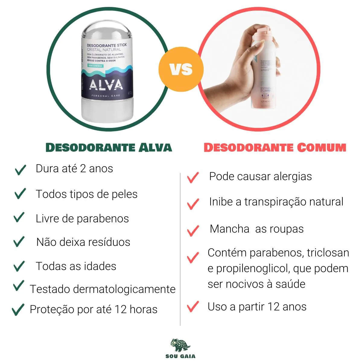 O Desodorante Cristal Alva é elaborado com um sal Mineral natural. Com duração de até 2 anos, ele combate as bactérias causadoras do mau odor sem obstruir os poros, não deixa manchas nas roupas ou resíduos na pele - e é a alternativa natural perfeita para cuidar de você!  O único ingrediente do Desodorante Cristal Alva é o alúmen de potássio, um poderoso sal mineral com efeito antibacteriano, que impede a proliferação de bactérias causadoras de maus odores. O alúmen de potássio não é absorvido pela pele por ter moléculas grandes, e reduz levemente a transpiração sem entupir os poros.       Ele é bactericida, pois elimina as bactérias que causam o cheiro e faz com que nosso Corpo transpire normalmente. O alúmen está presente normalmente em grandes depósitos em todo o mundo, em áreas de atividade vulcânica.       Alva Naturkosmetik é uma marca alemã premiada por seus produtos naturais.       Como funciona o nosso corpo?   Nós precisamos suar, é no suor onde liberamos toxinas, controlamos PH e temperatura do corpo, quando colocamos um desodorante antitranspirante, impedimos que todas essas reações naturais do corpo aconteçam.       E para onde vai essas toxinas?   Fica no nosso corpo, numa região super sensível que é a nossa mama, isso causa alergias, irritações, foliculite, nódulos e até mesmo doenças mais graves.       Por que o alúmen é tão eficaz nos desodorantes?   Quando o corpo humano transpira é liberado basicamente sal e água através das glândulas sudoríparas. Contrariamente à crença popular, o suor não tem um cheiro distinto. O cheiro desagradável é resultado do contato do suor com as bactérias do nosso corpo. As bactérias em nossa pele geralmente não produzem um odor perceptível, mas quando o suor está presente, a bactéria se prolifera rapidamente, criando cheiro. O alúmen é antimicrobiano, portanto, ele inibe o crescimento das bactérias das axilas.       Ao inibir o crescimento bacteriano o odor é impedido, e o corpo ainda é capaz de manter o seu próprio curso de eliminar toxinas através do suor, assim como de controlar a temperatura do corpo.       O desodorante da Alva é em forma de cristal que pode durar até 2 anos usando todos os dias. É translúcido, cristalino, inodoro e incolor e não mancha as roupas.        PRINCIPAIS BENEFÍCIOS:   - Sem cheiro e sem cor;   - Ideal para todos os tipos de peles, principalmente peles sensíveis;   - Adstringente (reduz o tamanho dos poros);   - Não mancha as roupas e não deixa resíduo;   - Bactericida;   - Cruelty Free;   - Vegano;   - Sem Álcool;   - Sem Triclosan;   - Sem Parabenos;   - Sem Perfume;   - Sem Cloridrato de Alumínio;   - Sustentável, por durar até dois anos, gera menos lixo que os desodorantes comuns;   - Não agride a camada de ozônio, já que não é aerossol, protegendo assim o planeta.       Modo de usar: Umedecer o cristal com água e aplicar em toda região das axilas, repetir quando secar ajuda na maior proteção. Não usar se a pele estiver lesionada ou irritada. Caso ocorra irritação suspender o uso. O cristal pode se soltar da base ao longo do uso. Se cair no chão, o cristal quebra.       Mudança de hábitos:       Esse é um produto que requer um novo ciclo, sempre explicamos para as pessoas que usam os nossos desodorantes que o processo de troca de um desodorante com o antitranspirante (cloridrato de alumínio) tem um processo de adaptação que pode demorar uns 15 dias.       Alinhados com uma alimentação saudável, muita água e exercício físico o resultado é fantástico.       Todas as mudanças que temos em nossas vidas o nosso corpo sente, imagine, quando estamos usando os desodorantes convencionais, acostumamos nossa pele a não suar a vida toda, a não eliminar toxinas, e quando você começa a fazer isso, temos um período de adaptação.   Composição: Potassium Alum.   Fórmula livre de: óleo mineral, parafinas e outros derivados de petróleo, silicones, parabenos, ftalatos, tolueno, laurel, sulfato de sódio, cloridrato de alumínio, polietilenoglicóis (PEGs, liberadores de formaldeído, corantes e fragrâncias sintéticas, triclosan, metais pesados, talco e produtos de origem animal.    Não é testado em animais.