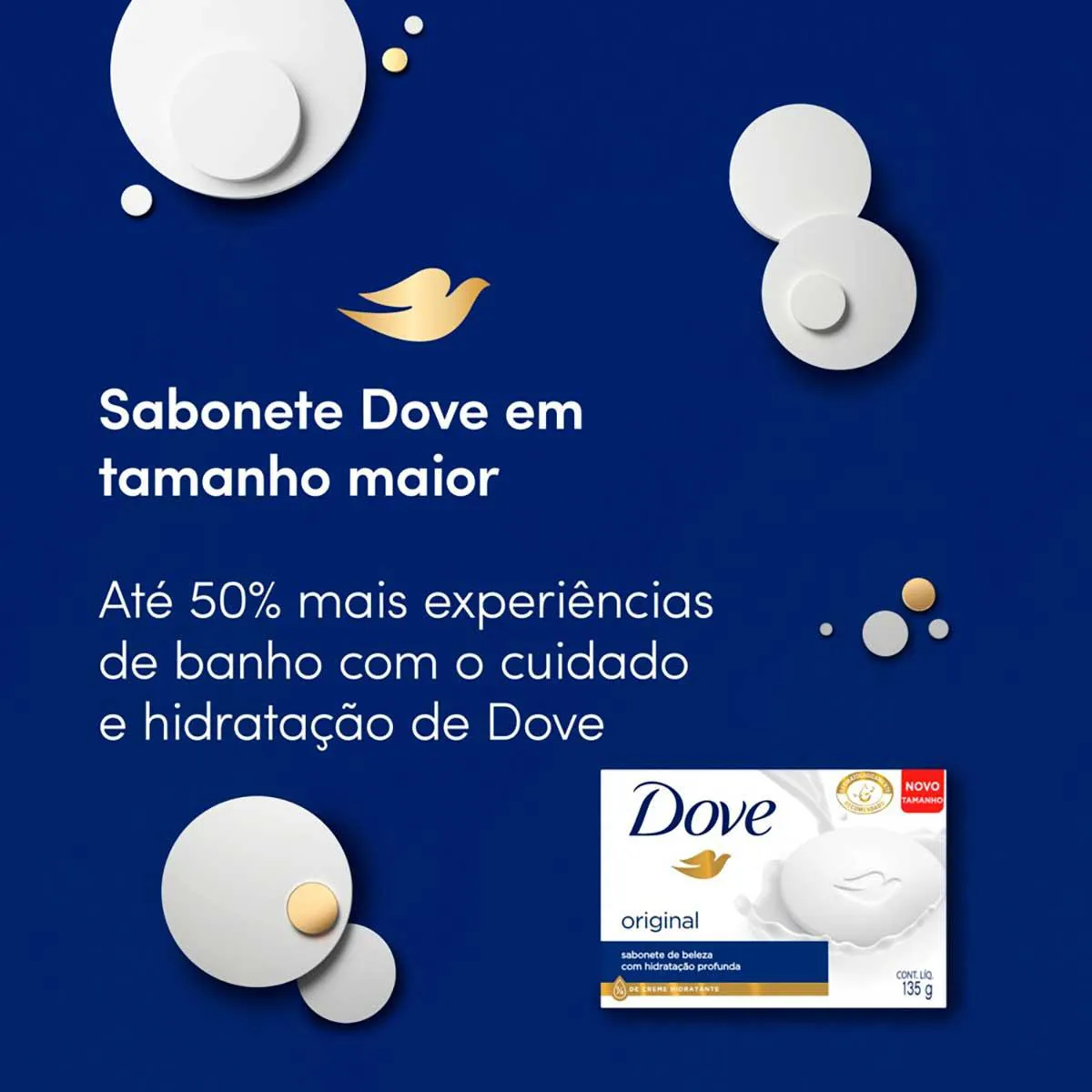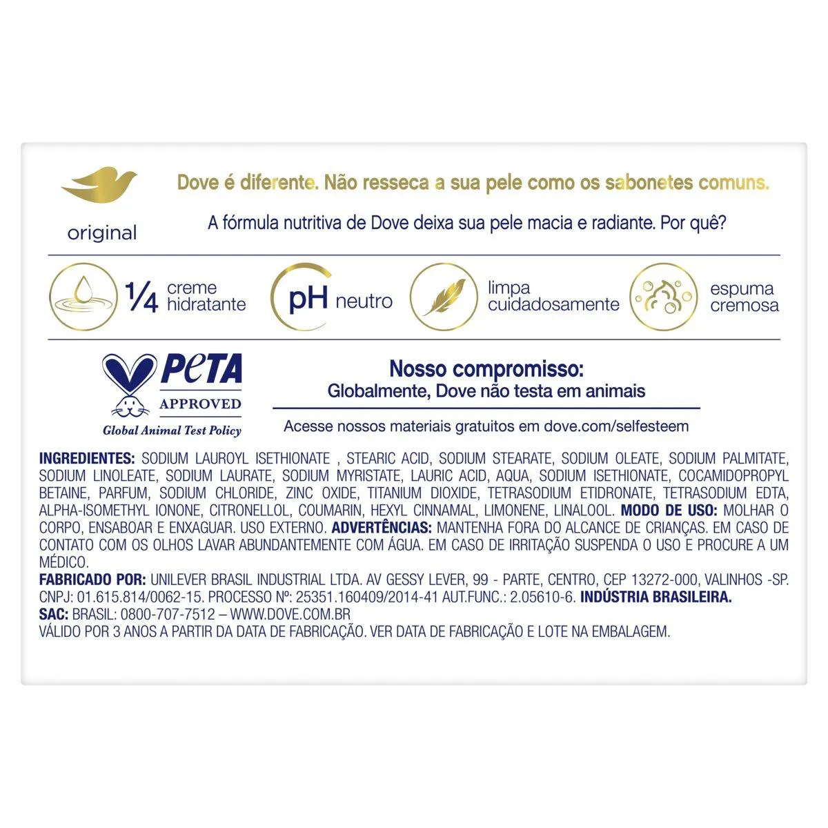 Dove Original é o sabonete de Beleza que ajuda a proteger a hidratação natural da sua pele. Com pH neutro, agentes de limpeza suaves e ¼ de creme hidratante na sua composição, mantém a maciez e a suavidade que a sua pele merece. Não resseca como os sabonetes comuns, e deixa a sua pele bem cuidada e com aspecto saudável. Use-o diariamente e revele uma pele viva, macia e poderosa.