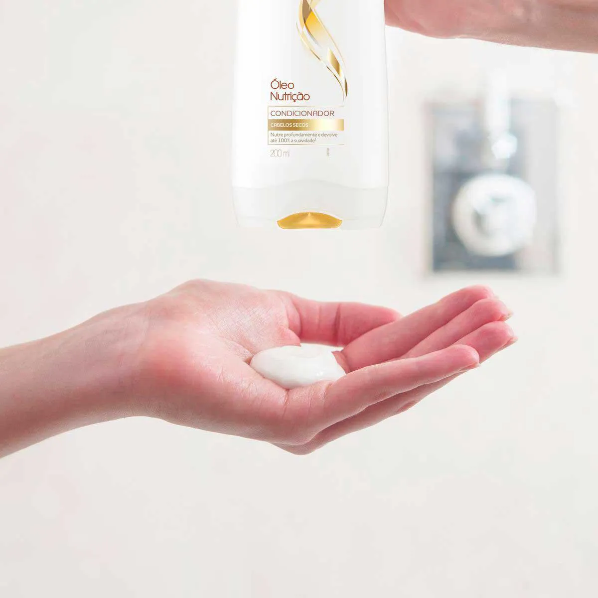 Coloque o Shampoo Dove Ritual de Fortalecimento nas Mãos e aplique-o diretamente nos cabelos molhados. Massageie bem a raiz e enxágue.