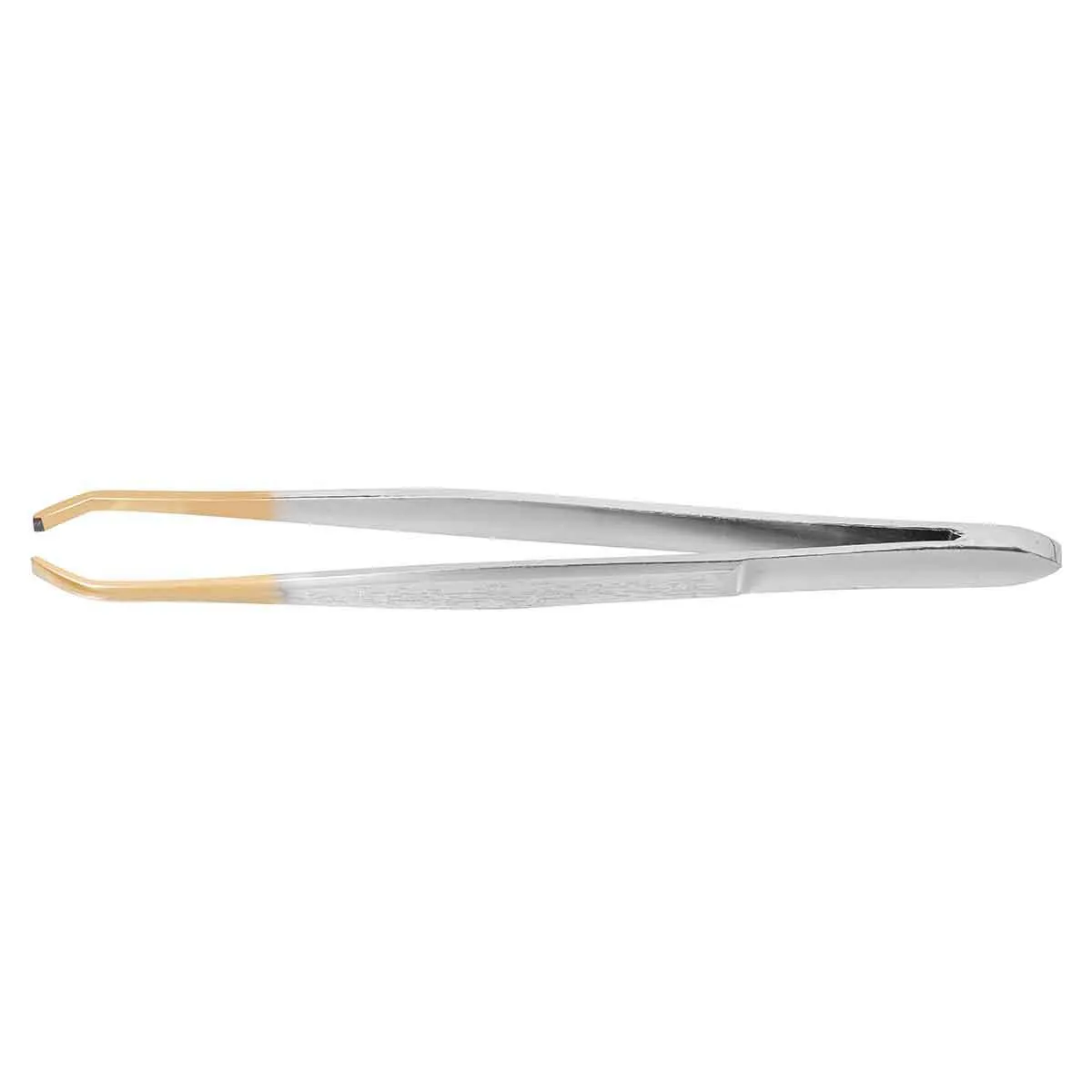 Pinças para pelos em aço inoxidável na cor prata com ponta dourada diagonal. Ideal para remover os pelos das sobrancelhas sem quebrá-los. A pinça também pode ser utilizada para remover os pelos que a depilação com lâminas tenha ficado para trás.