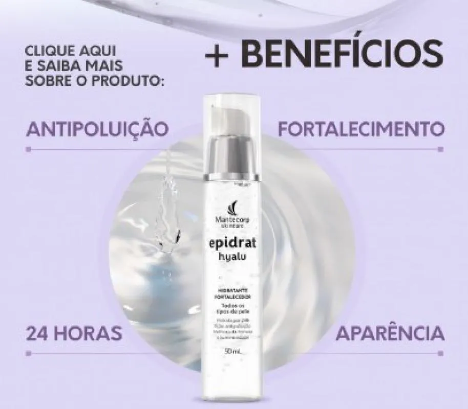 Através de sua leve textura, o hidratante fortalecedor Epidrat Hyalu promove hidratação de até 24h, auxilia na melhora da aparência de rugas , além de reduzir os danos ocasionados pela poluição e regenera e fortalece a barreira cutânea da pele.