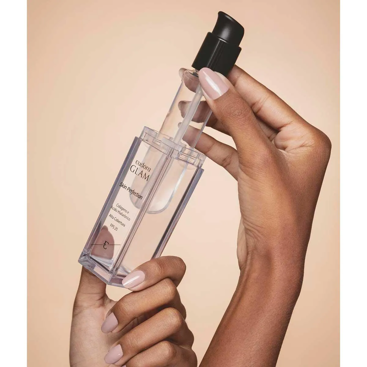 Indicada para todos os Tipos de pele, a Glam Skin Perfection é uma linha exclusiva de base líquida da Eudora, que oferece alta cobertura e efeito mate, aliada ao duplo tratamento do Colágeno, que recupera a elasticidade da pele e o Ácido Hialurônico, que preenche e reduz linhas finas.