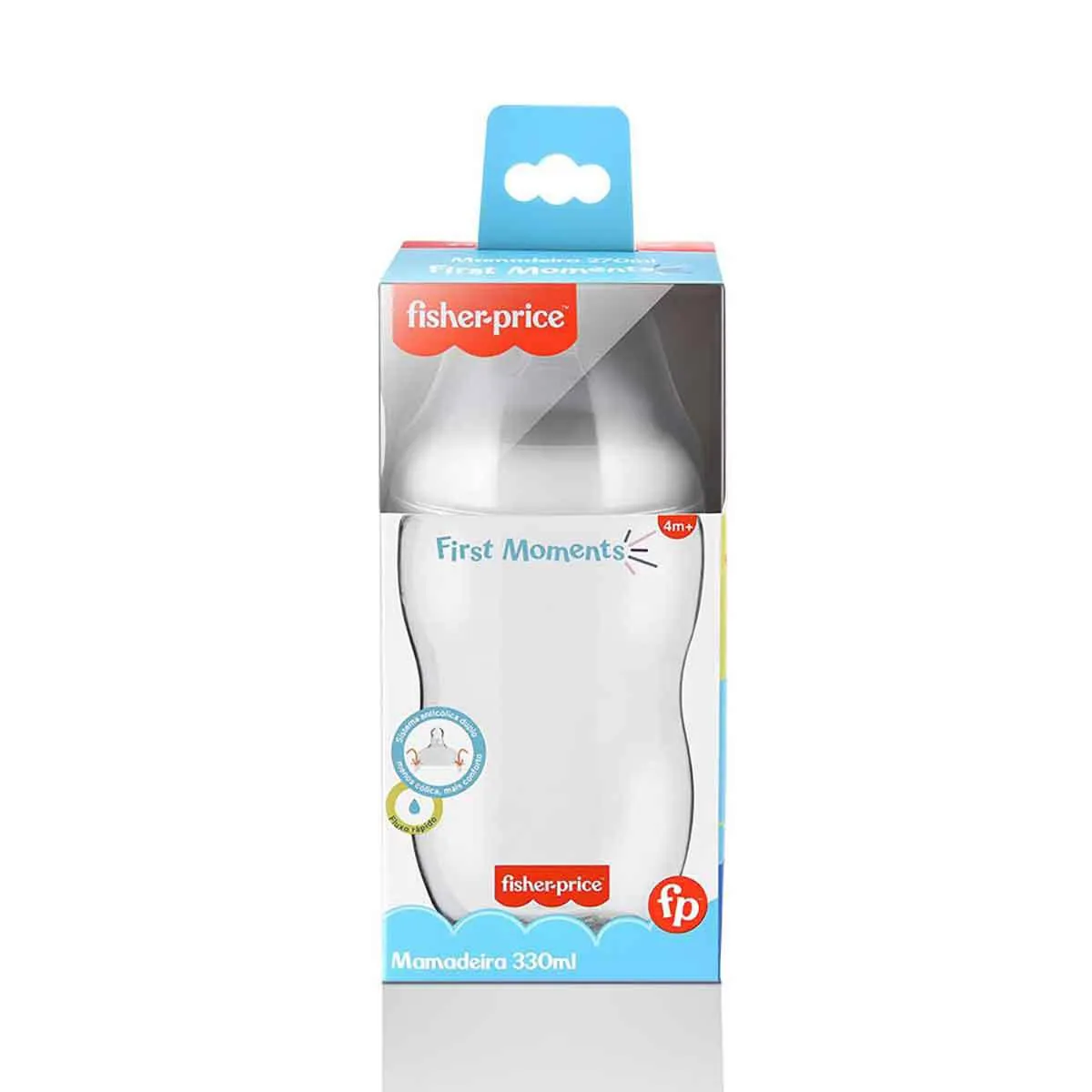 As mamadeiras First Moments Fisher-Price possuem bico em silicone macio e flexível, com base mais larga, assim como o seu bocal. Além disso, as mamadeiras são feitas com rosca de fácil encaixe. Possui sistema de ventilação dupla, com duas válvulas de ar no bico. São totalmente livres de BPA. Desenvolvida para proporcionar a melhor experiência de alimentação. Bocal Largo facilita o enchimento e bico com base larga se assemelha ao seio materno auxiliando na transição contínua entre seio e mamadeira. Design ergonômico e exclusivo – rosca de fácil encaixe e garrafa desenvolvida de acordo com as habilidades de motricidade fina para facilitar o manuseio. Eficiência anticólica – bico com duas saídas de ventilação flexíveis que melhoram a aeração durante a hora de mamar e reduzem o risco de ingestão de ar. Válvulas abrem de acordo com intensidade da sucção - o ar circula de fora para dentro da garrafa equilibrando a pressão interna e prevenindo que o ar seja ingerido e cause cólicas. Poucas peças simplificam na hora de montar, esterilizar e de lavar. Totalmente livre de BPA.