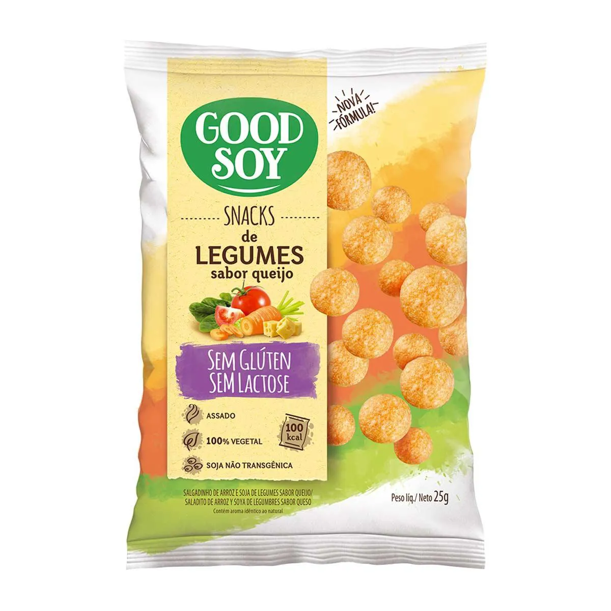O Snacks Goodsoy Legumes ao Queijo 25g é feito de farinha de arroz, farinha integral de soja não transgênica, tomate, cenoura e espinafre desidratados, óleo vegetal (palma, soja), condimento preparado sabor queijo, ervas aromáticas, sal light, açúcar e corante urucum.