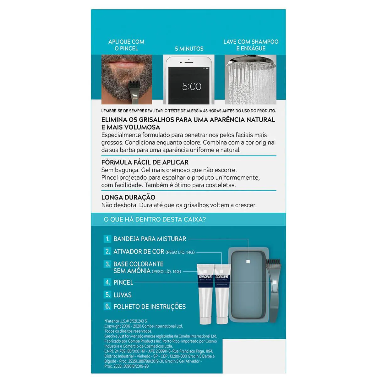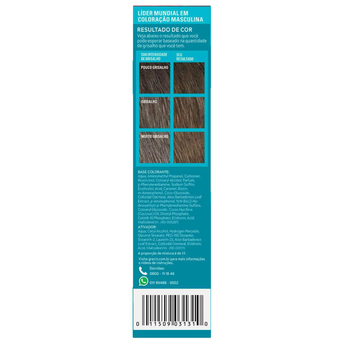Color Gel Barba e Bigode Grecin 5 Castanho conta com fórmula suave e sem amônia que tonaliza os fios brancos em apenas 5 minutos. Devolve o tom natural da barba, bigode, costeletas e têmporas que combinam com o tom dos cabelos.