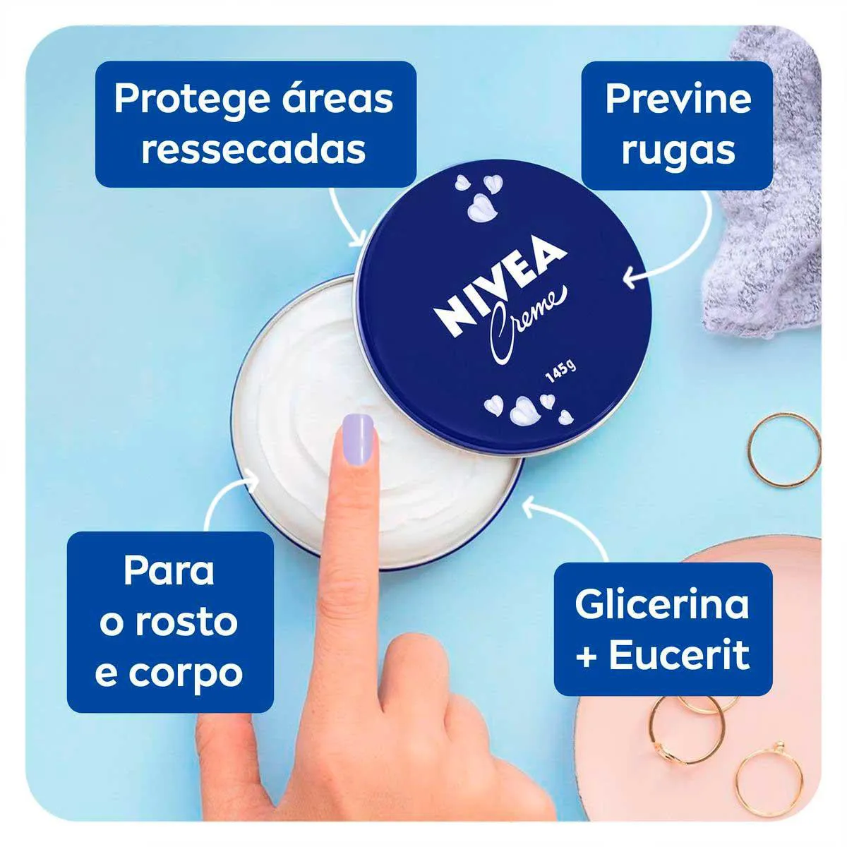 - Creme tradicional da Nivea, há mais de 100 anos promovendo multibenefícios para a pele.