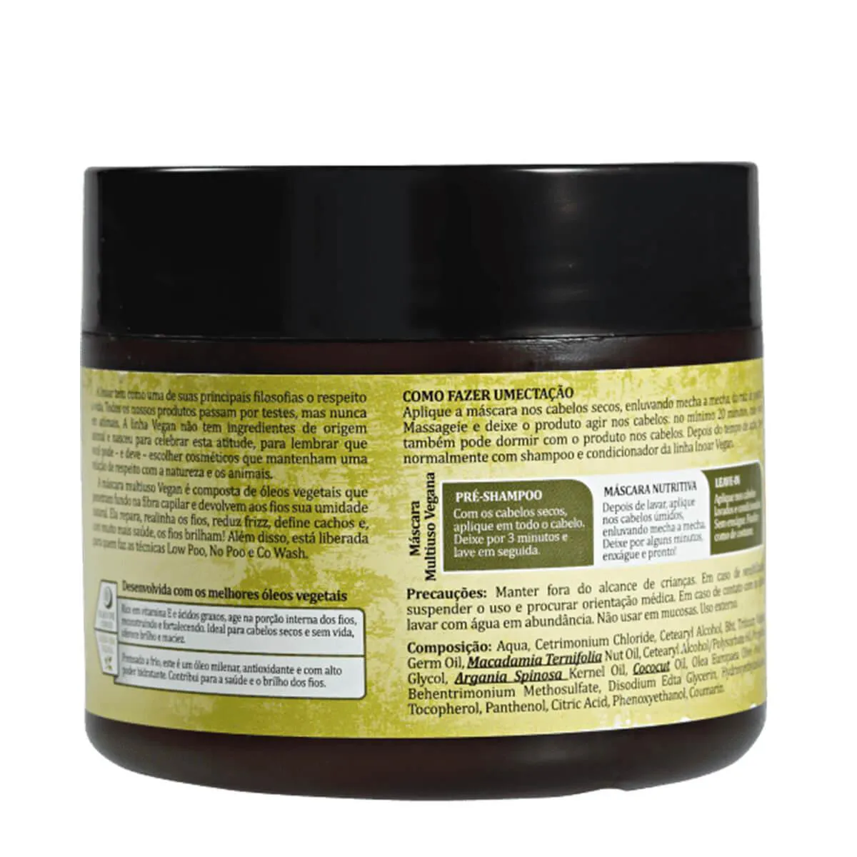 A Máscara multiuso Vegan penetra fundo na fibra capilar e devolve aos fios sua umidade natural. Ela repara, realinha os fios, reduz frizz, define cachos e, com muito mais saúde, os fios brilham.