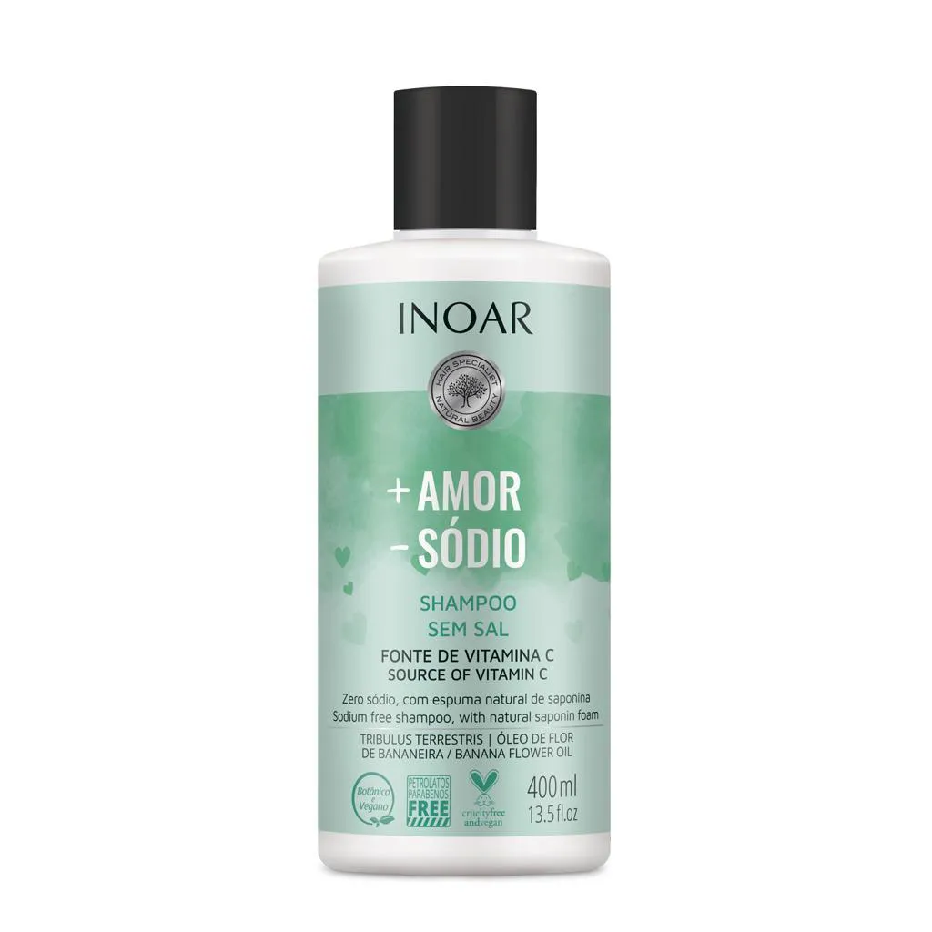 Shampoo Inoar Mais Amor, Menos Sódio é formulada com Tribulus Terrestris, erva rica em vitamina c e fonte de saponinas, e o Óleo de Flor de Bananeira, fonte natural de potássio.