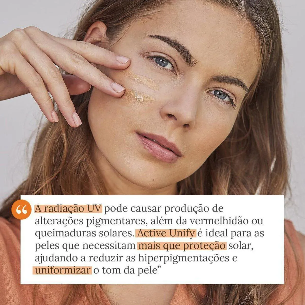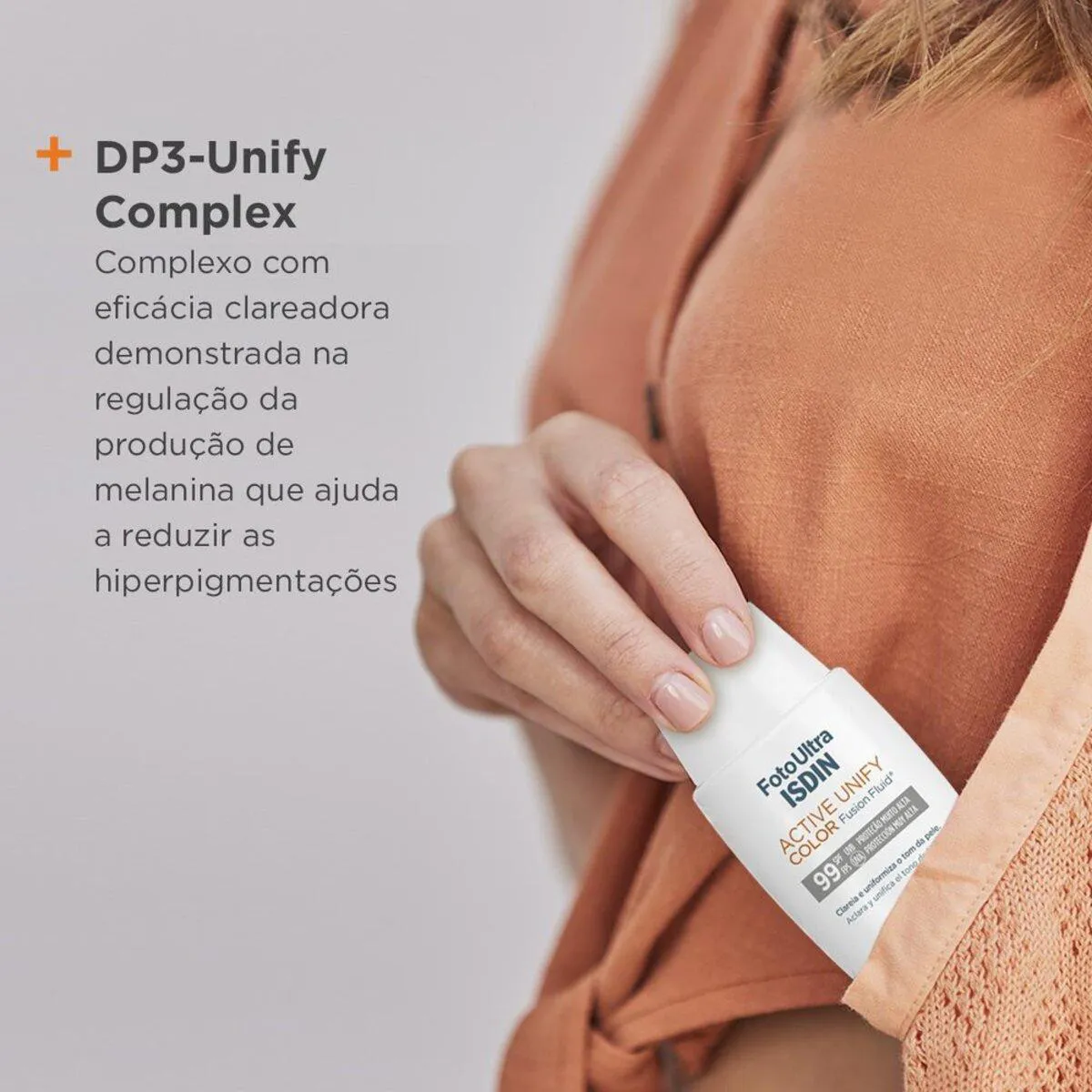 O Isdin FotoUltra Active Unify Fusion Color é um clareador facial com proteção solar e cor universal, que auxilia a uniformizar o tom da pele.