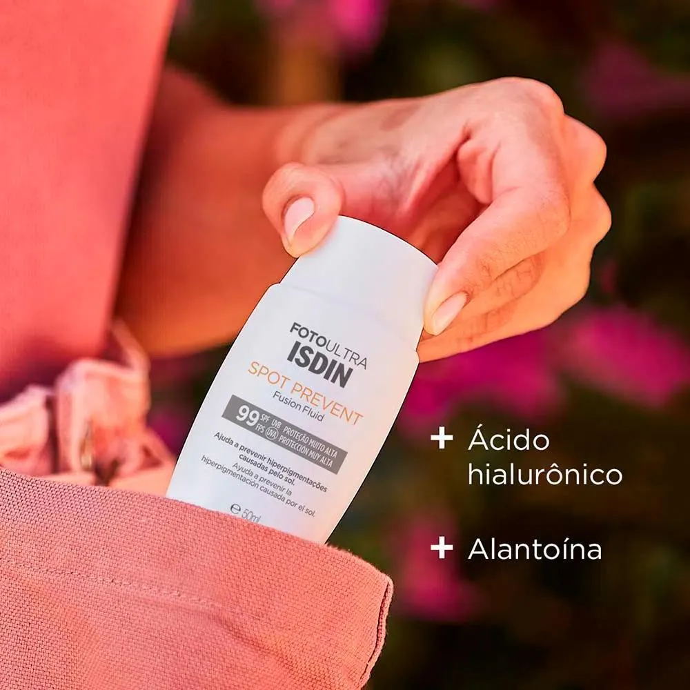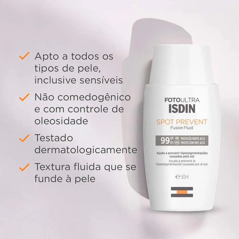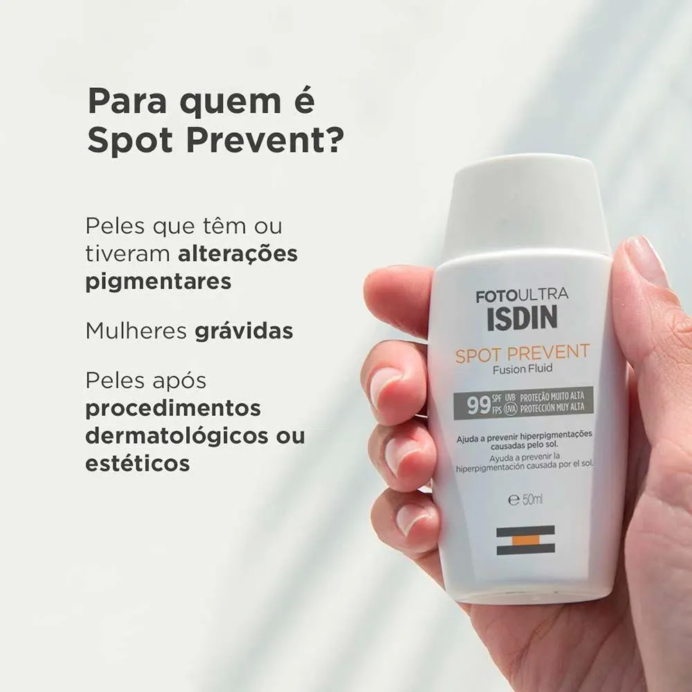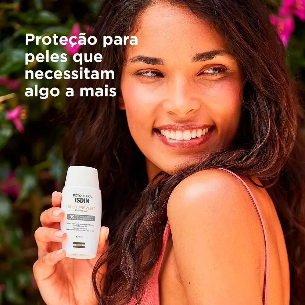 O Protetor Solar Fotoultra Isdin Spot Prevent É Indicado Para Pele Que Necessita Mais do Que Proteção. o Fotoprotetor Facial Isdin Spot Prevent Oferece Um Fator de Proteção 3 Vezes Maior do Que o Mínimo Exigido Para Um Fotoprotetor Fps 99. Excelente Cosmeticidade com Textura Fusion Fluid Que Se Funde com a Pele Proporcionando Uma Aplicação Diária Agradável. * RESULTADO: Proteção Solar * SUGESTÕES DE USO: 1.Aplique uma quantidade razoável de produto sobre toda a região da face. 2.Repita o procedimento de 2 em 2 horas ou sempre que a pele entrar em contato com a água ou com o suor excessivo. * OBSERVAÇÕES: Imagem Meramente Ilustrativa * ITENS INCLUSOS: 1 Protetor Solar Facial Isdin Foto Ultra Spot Prevent FPS 99 50 ml