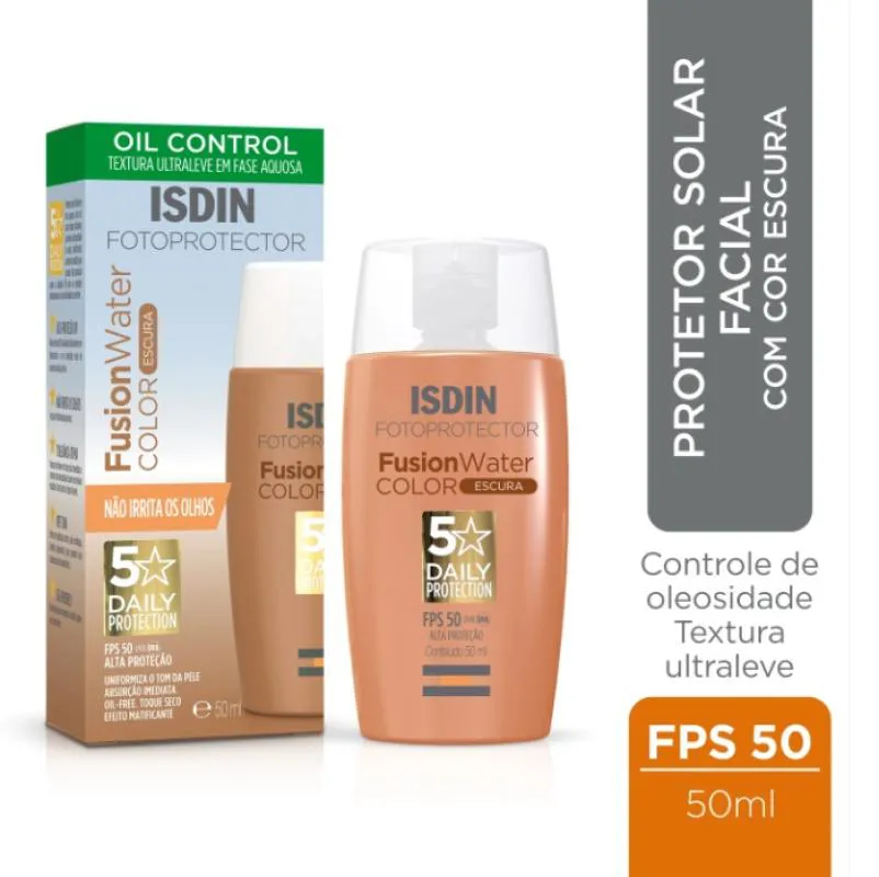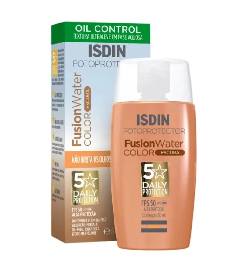 O Protetor Solar ISDIN Fusion Water 5 Stars Color FPS 50 conta com uma textura ultraleve, de rápida absorção e à base de água, que ajuda no controle da oleosidade e ajuda a uniformizar o tom da pele e disfarçar imperfeições.