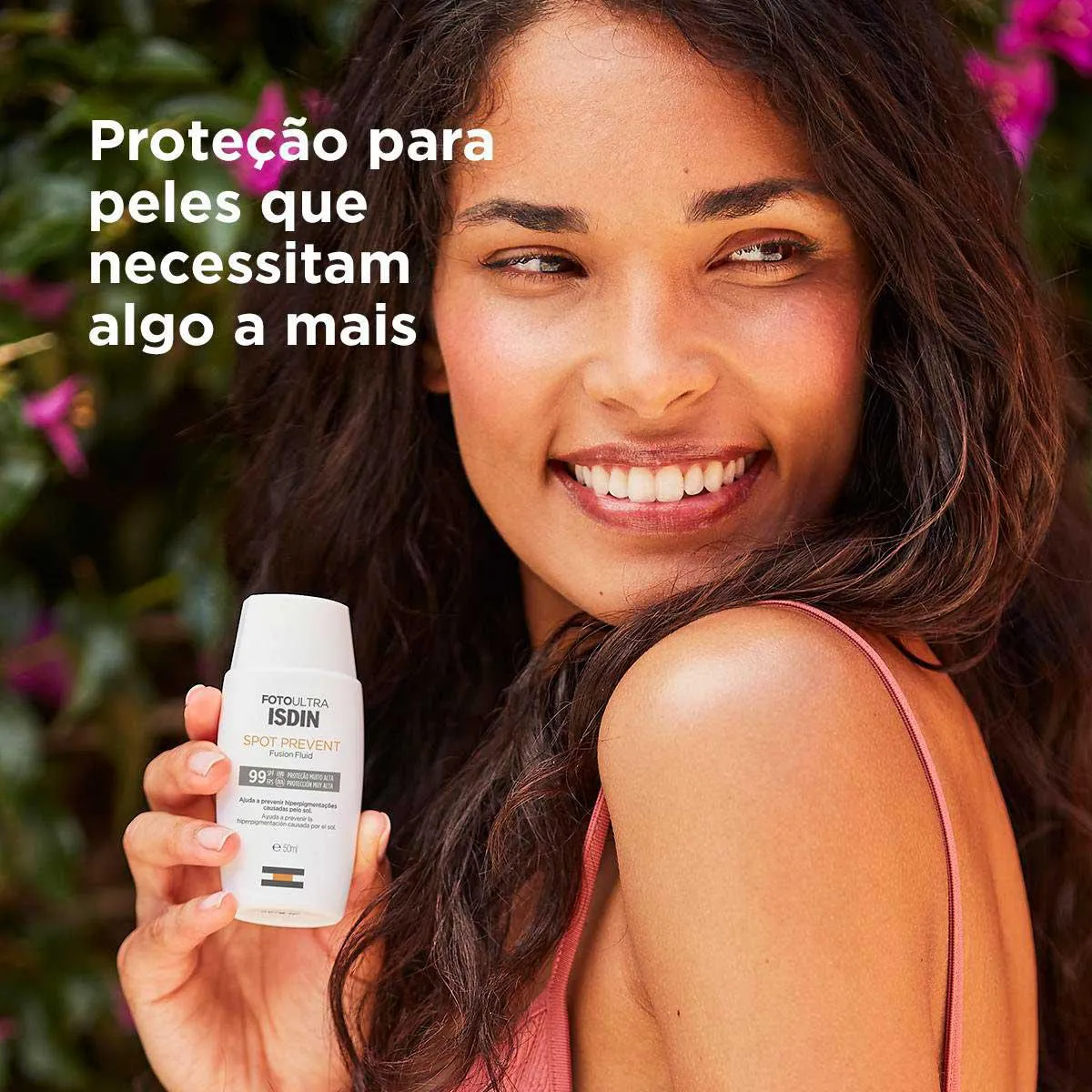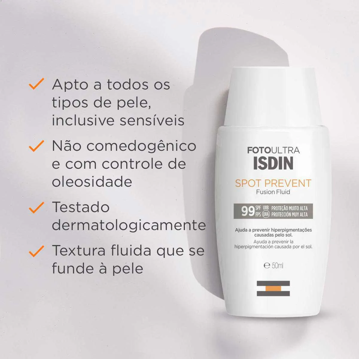 Além disso, o Protetor Solar Facial Isdin Spot Prevent FPS 99 possui textura Fusion Fluid que se funde com a pele para uma aplicação diária mais confortável. Ideal para ser aplicado antes da maquiagem, ele é resistente à água e hipoalergênico, ou seja, reduz o risco de irritações em contato com a pele.