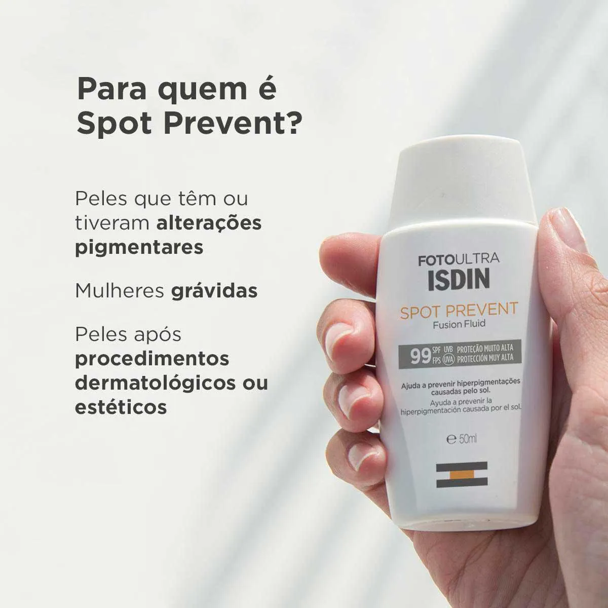 Isdin Spot Prevent é indicado para pessoas que procuram prevenir a hiperpigmentação da pele causada pelo sol, uma vez que ele possui alta proteção UVA e UVB. Ele ajuda também a clarear e uniformizar as marcas escuras causadas pelo sol, com um fator de proteção UVA 3 vezes maior do que o mínimo exigido para um fotoprotetor FPS 99.